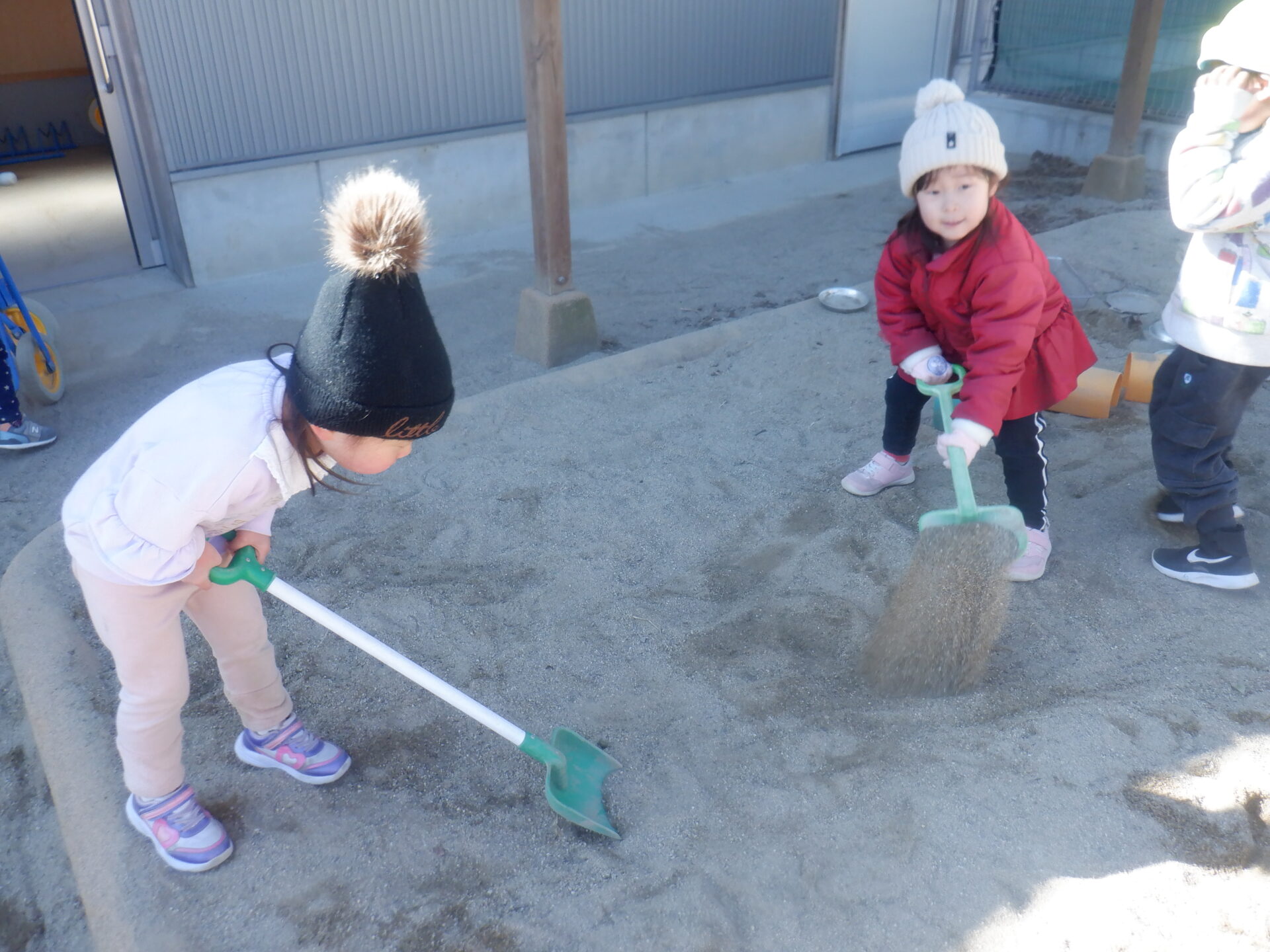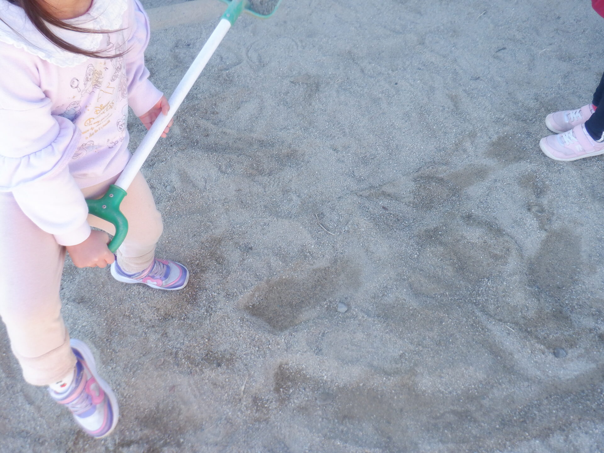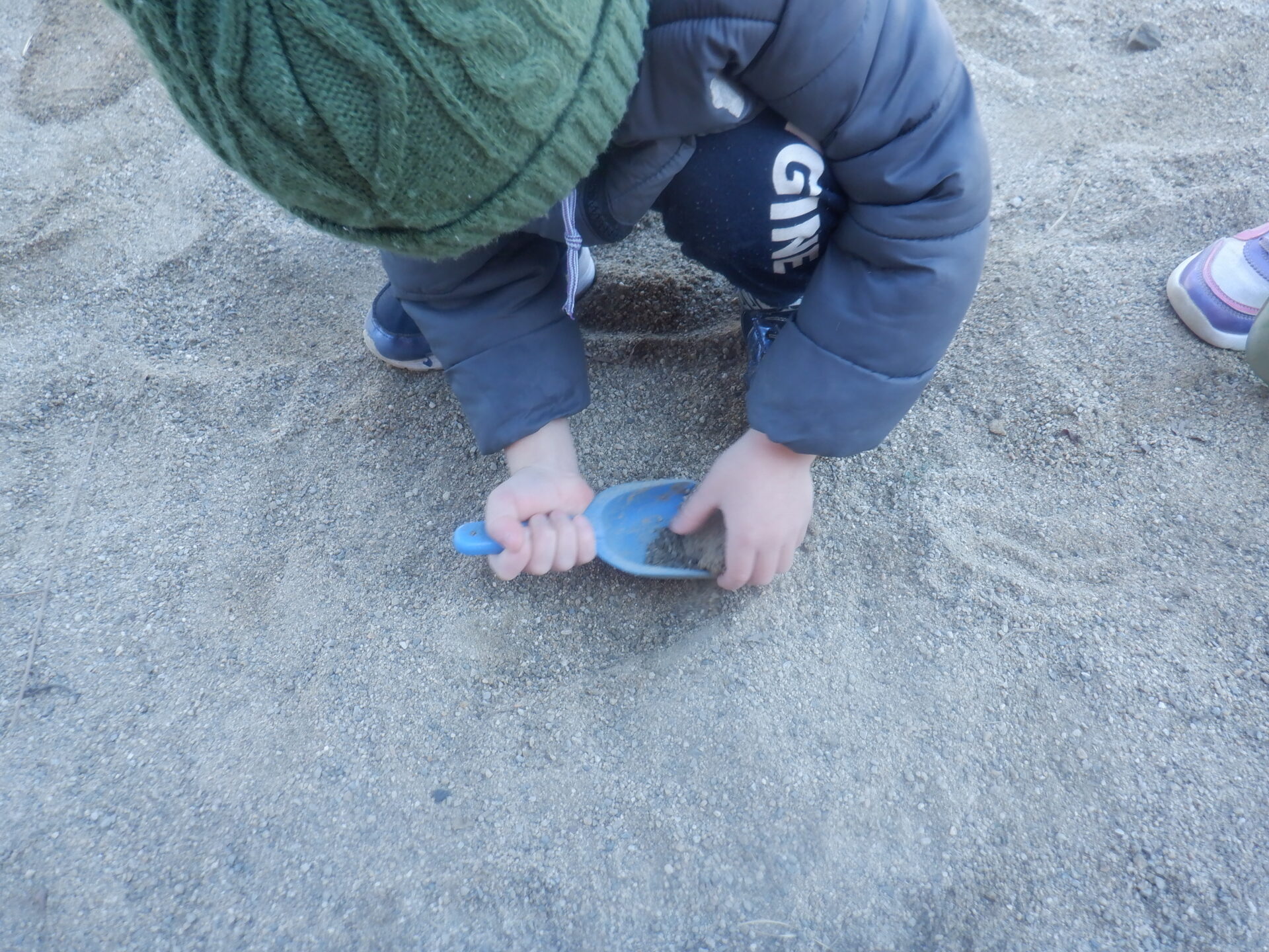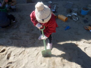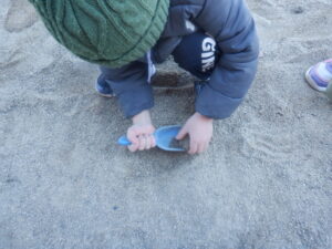 砂場がカチカチに固まっていて、はじめは保育士に「掘れない!」と訴えていましたが、
