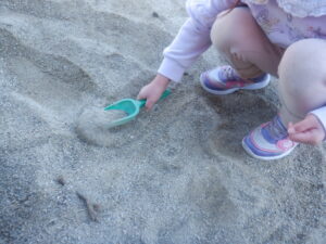 日の当たるところだと砂が柔らかく、掘りやすいことに気が付きました。