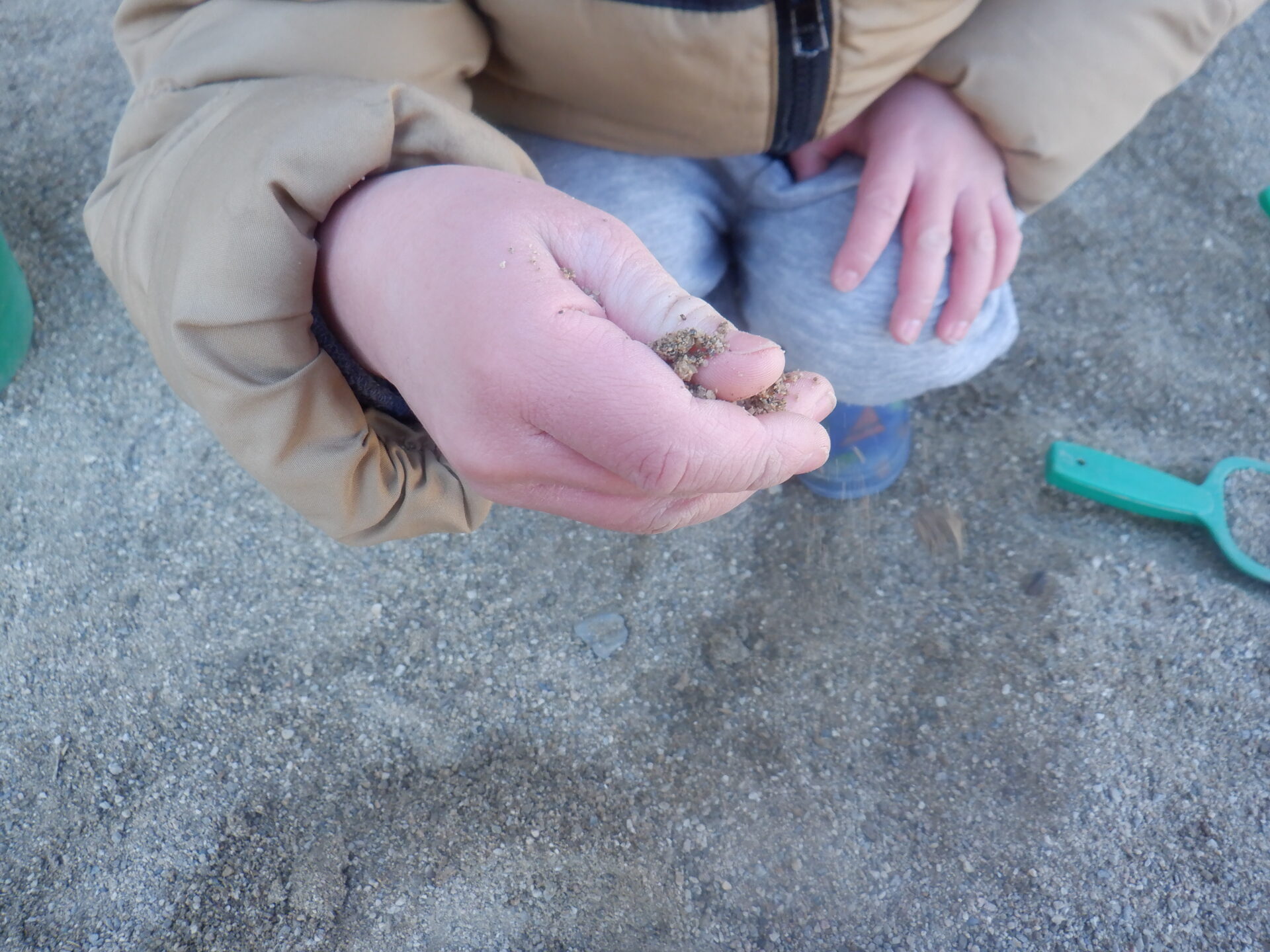 砂のかたまりを握ったり、つぶしたりして、ぽろぽろと崩れる感触を楽しむ姿がありました。