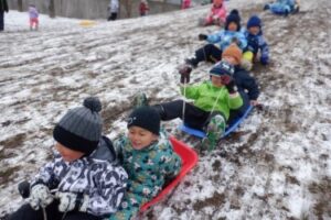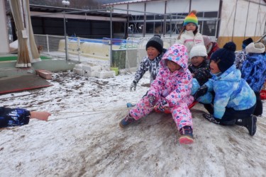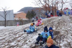 「ソリがしたい」と園庭の築山でソリ滑りを楽しみました。