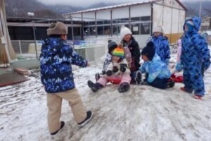 子どもたちはうれしそうにスキーウエアを着て、園庭に出て遊び始めました。
