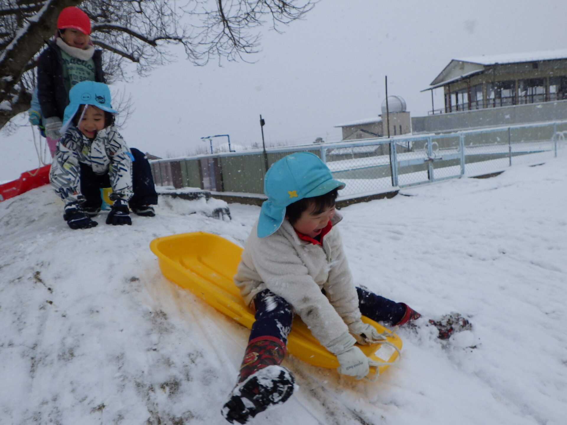 築山ではそりすべりが始まりました。はじめは怖がっていたお友だちも、大きい友だちの刺激を受けて次々に挑戦します。繰り返し滑るうちに、身体を後ろに傾けて滑ると早くなることに気づいた子もいました。