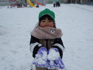 年少さんは興味津々で雪に触れてみます。「冷た〜い!」とびっくりしたり「気持ちいい!」と雪に寝転ぶ子もいました。「ぎゅってやったら変な形できた〜!」と嬉しそうに見せてくれたお友だちは、その後たくさん玉を作っては投げて、雪合戦を楽しみました。