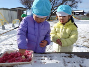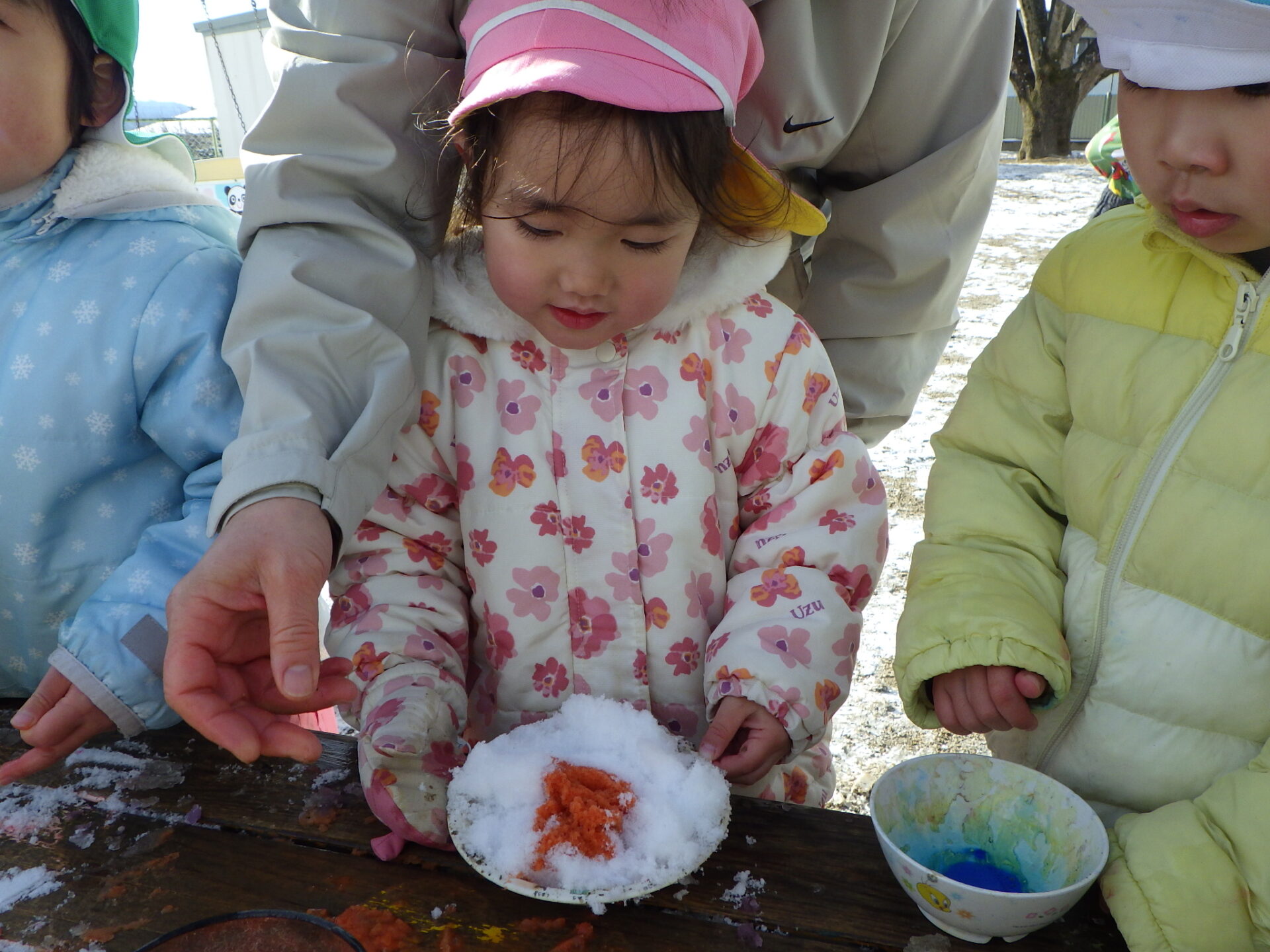 雪で遊ぶうちに「かき氷みたい!」と気づいた年中さん。保育士が絵の具を水で溶いた色水を用意すると、かき氷やさんが始まりました。「イチゴ味だよ!」と見立てる子、色水をたくさんかけて色が混ざっていく様子を楽しむ子、雪と絵の具をスプーンで混ぜてシャクシャクという音を楽しむ子など、様々な姿がありました。