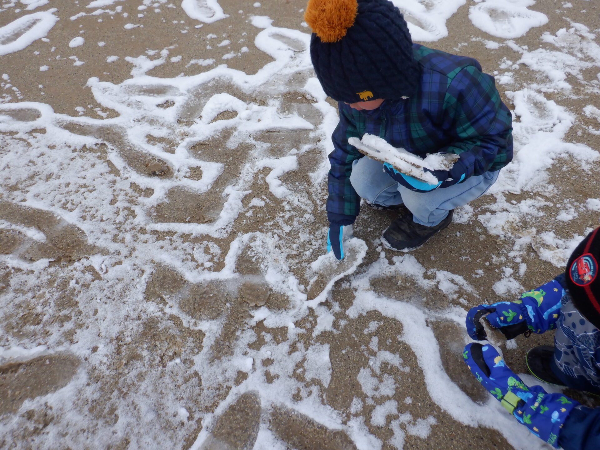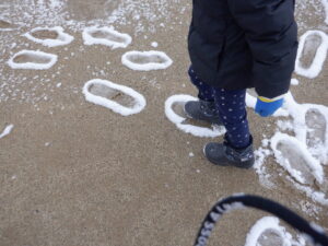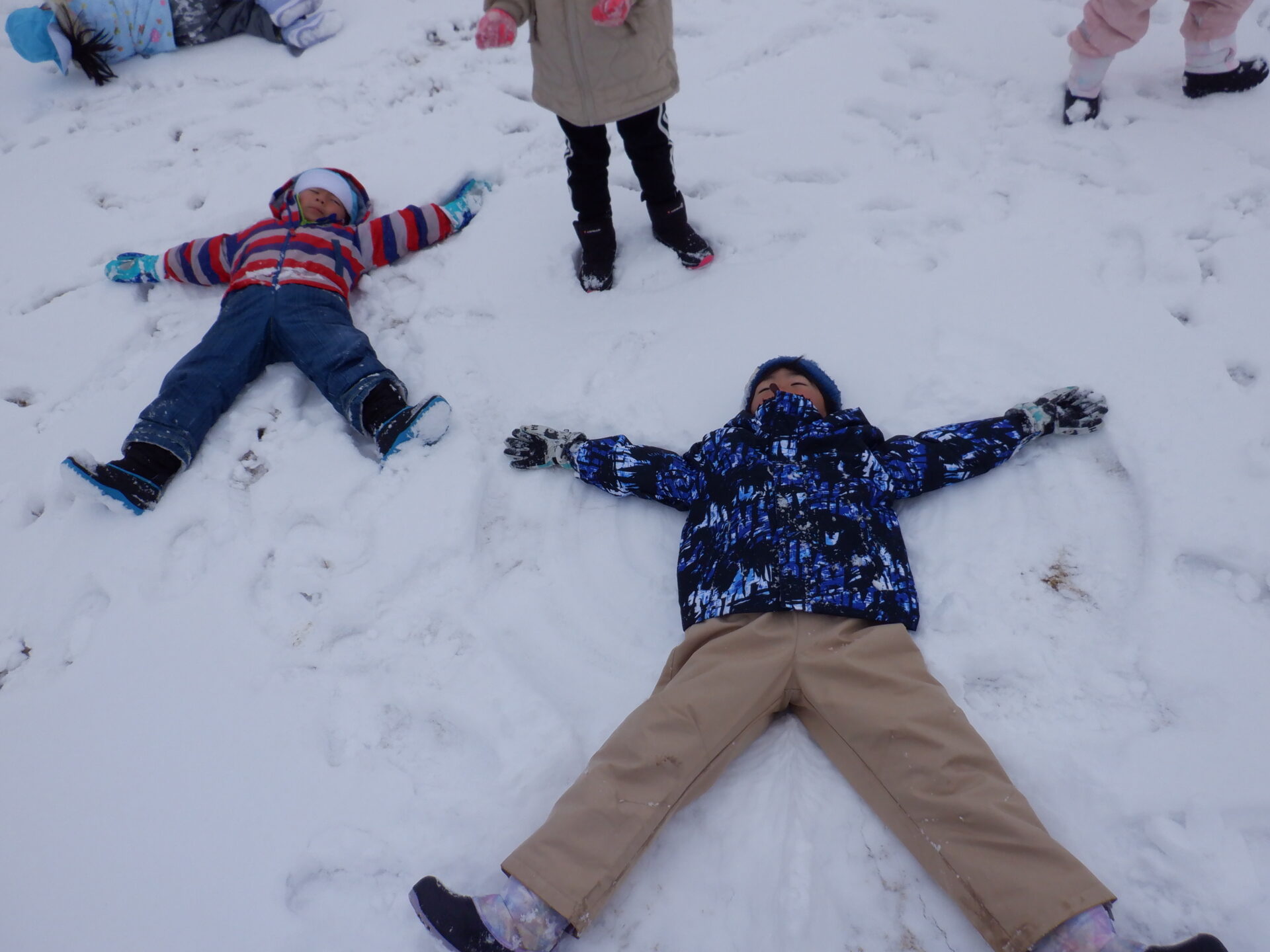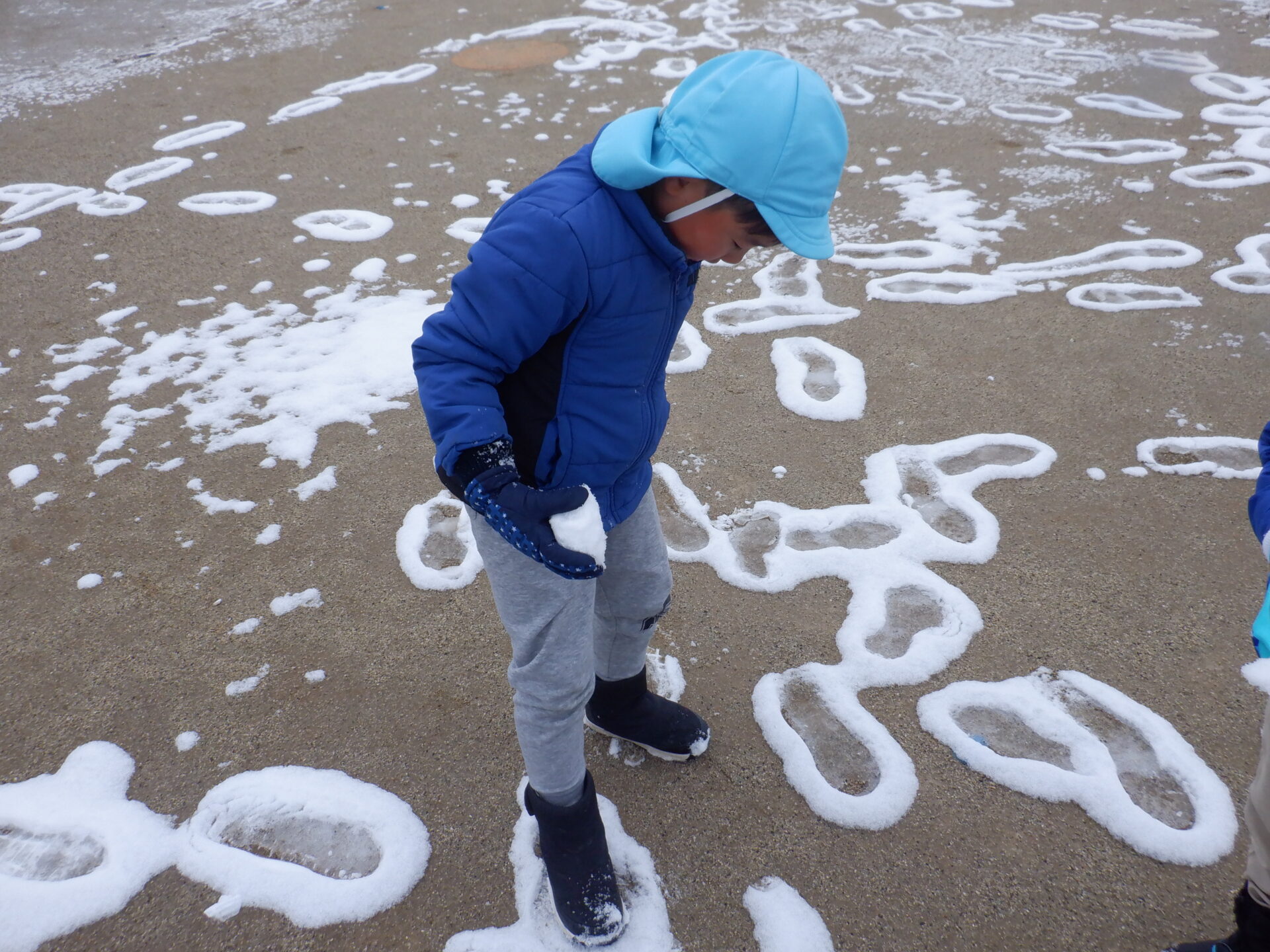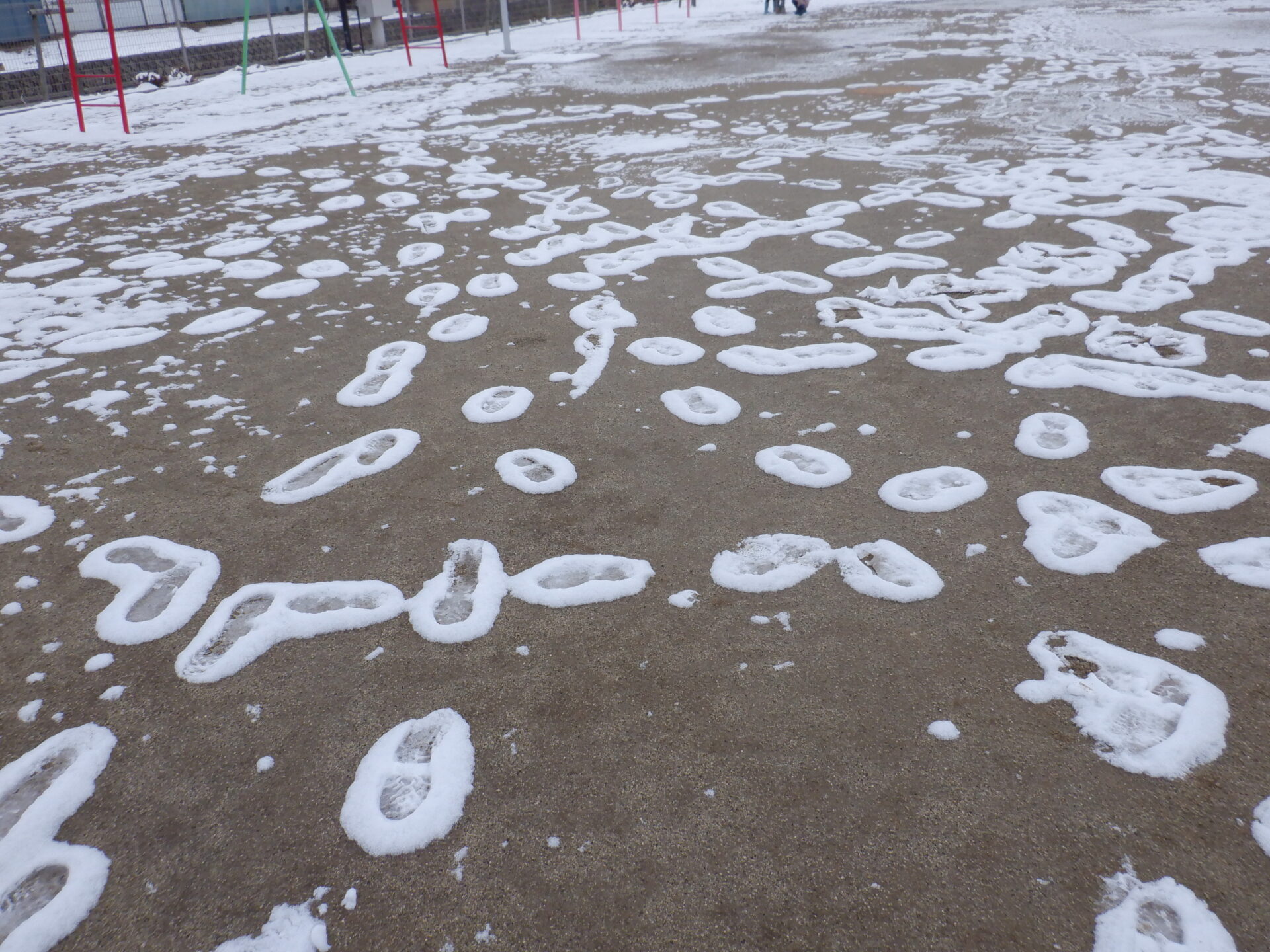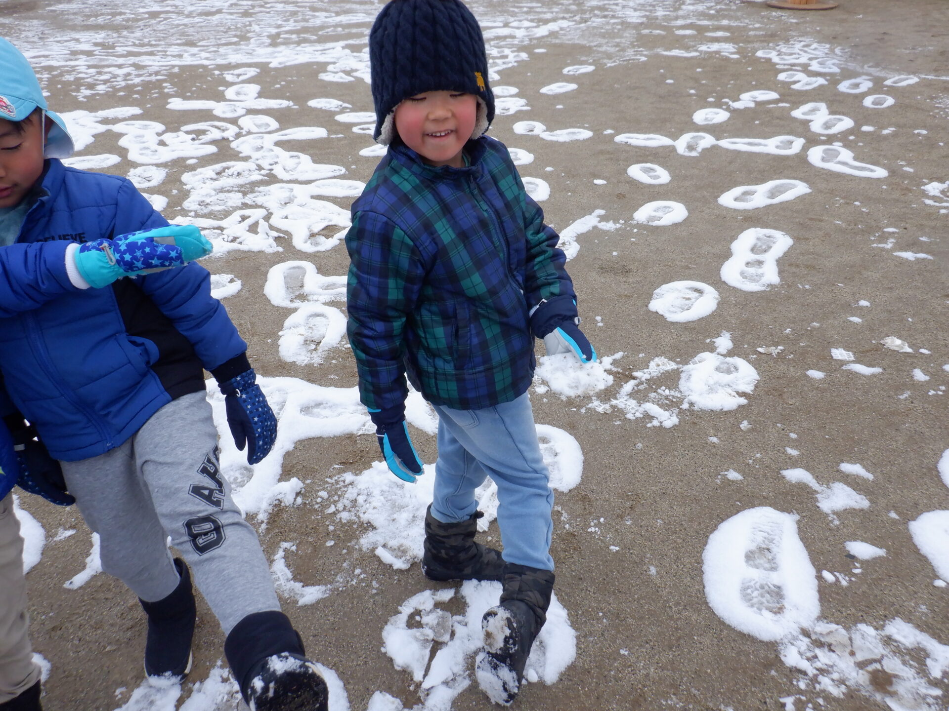 今年は雪が少なく、待ちに待った雪遊びでした。昨日の降園時に「雪だ!!」と喜んでつけていった園庭の足跡が明朝にこのような形で残っていると思わず「だれの??」と遊びを楽しんでいました。最終的には昨日の足跡、と気づいたのですが1つ1つ足跡の大きさや模様の違いがあることに気づき、友達と想像を膨らませて楽しんでいました。