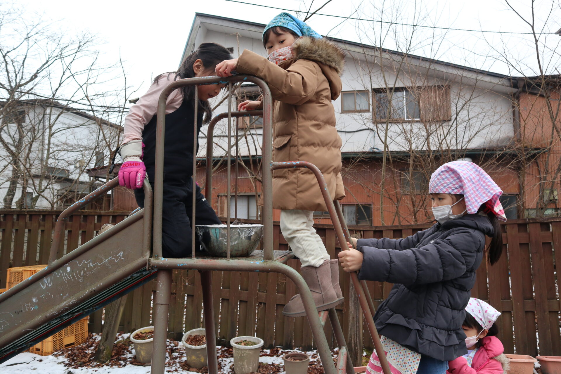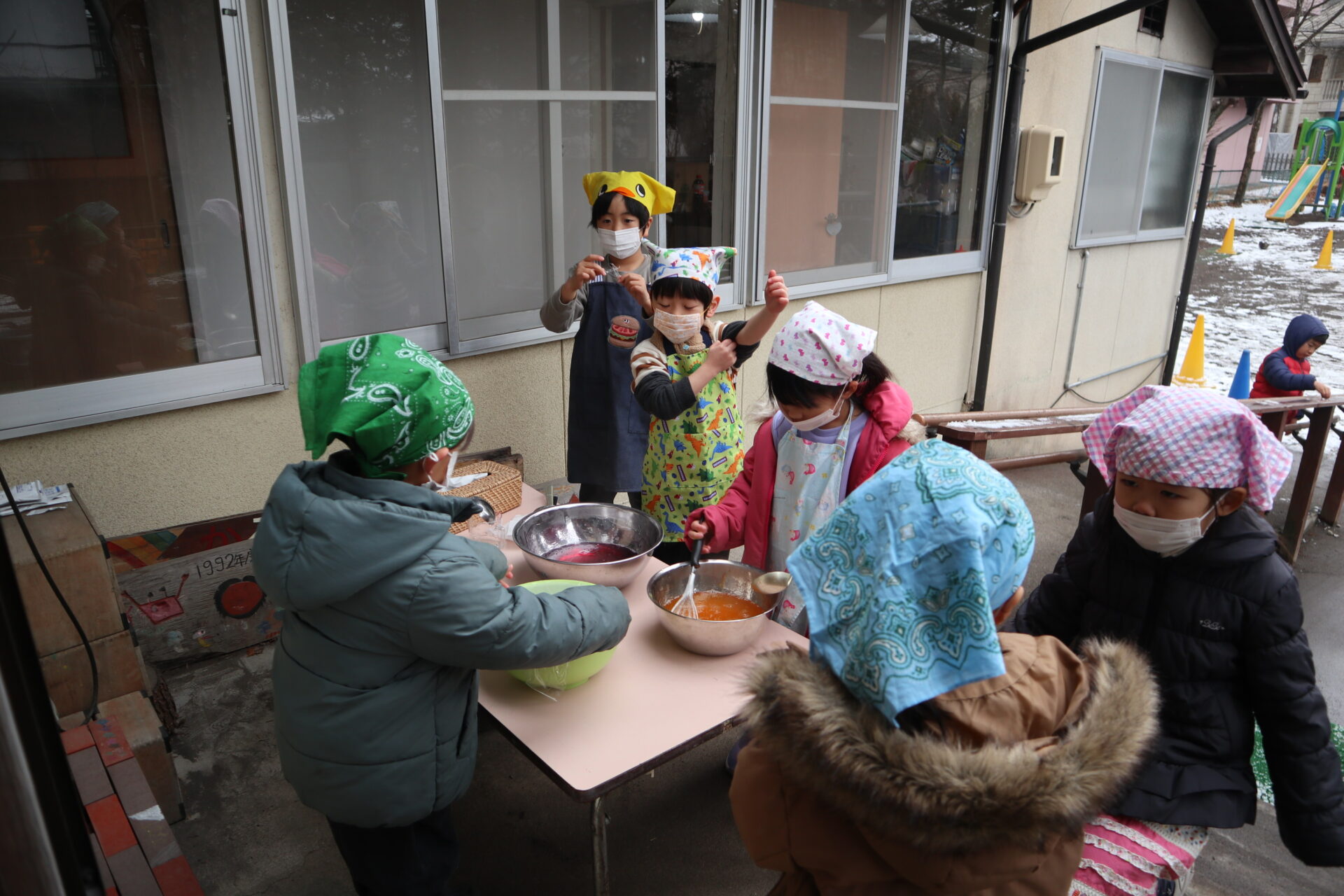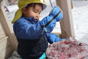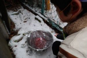 「冷蔵庫みたいに寒いね」「ゼリーも外で作ったら固まるのかな?」「やってみよう」と子どもたちの言葉から実験をしてみることになりました。