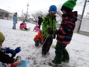 登園すると「今日は雪遊びできるよね!?」「ソリできるかな!?」とワクワクした表情の子どもたち。スキーウェアを着ると大喜びで園庭に飛び出して行きました!