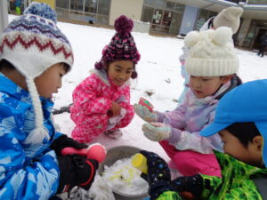 「そうだ!かき氷屋さんごっこしようよ!」と友達と一緒にお皿に雪を入れると