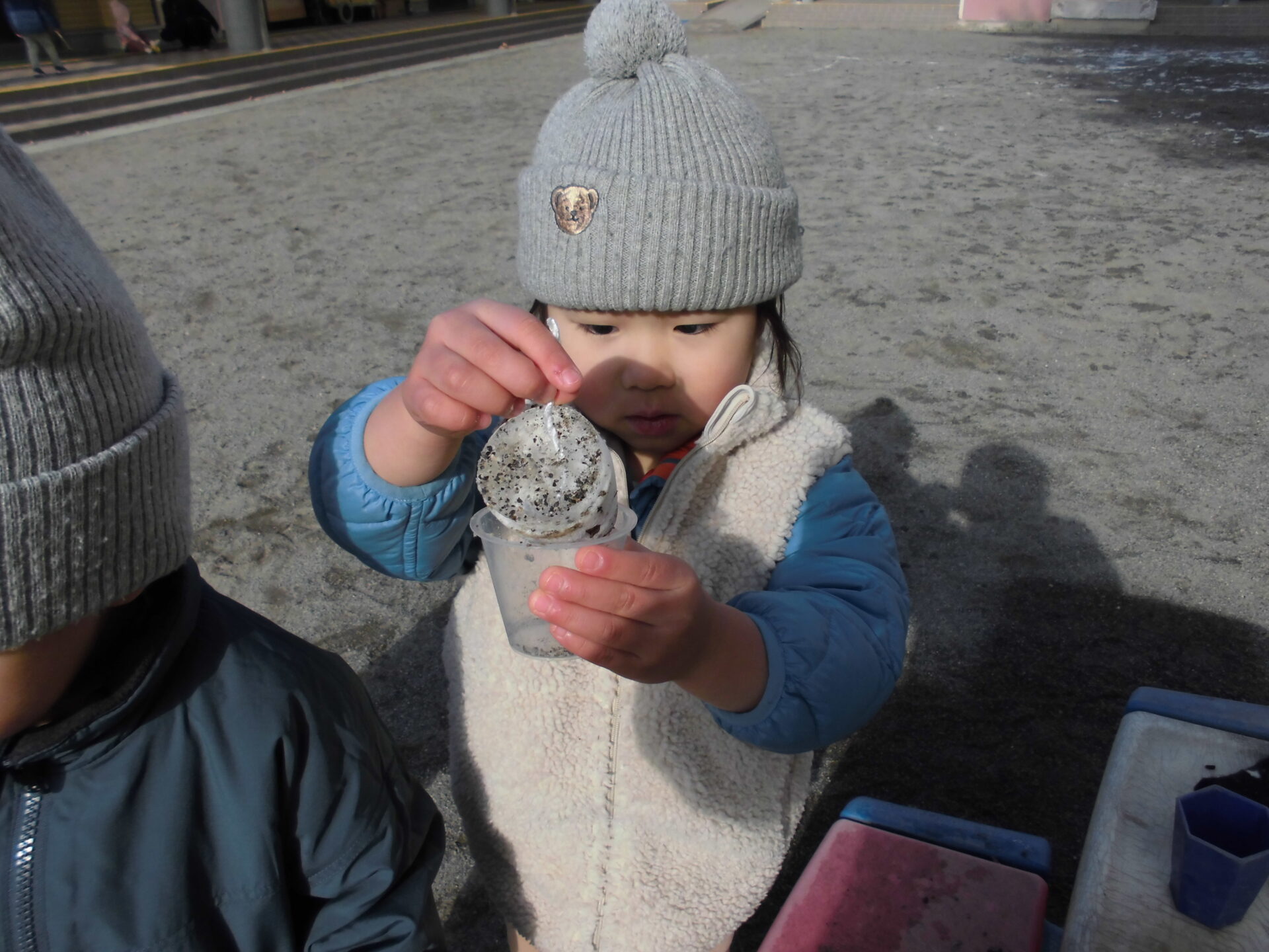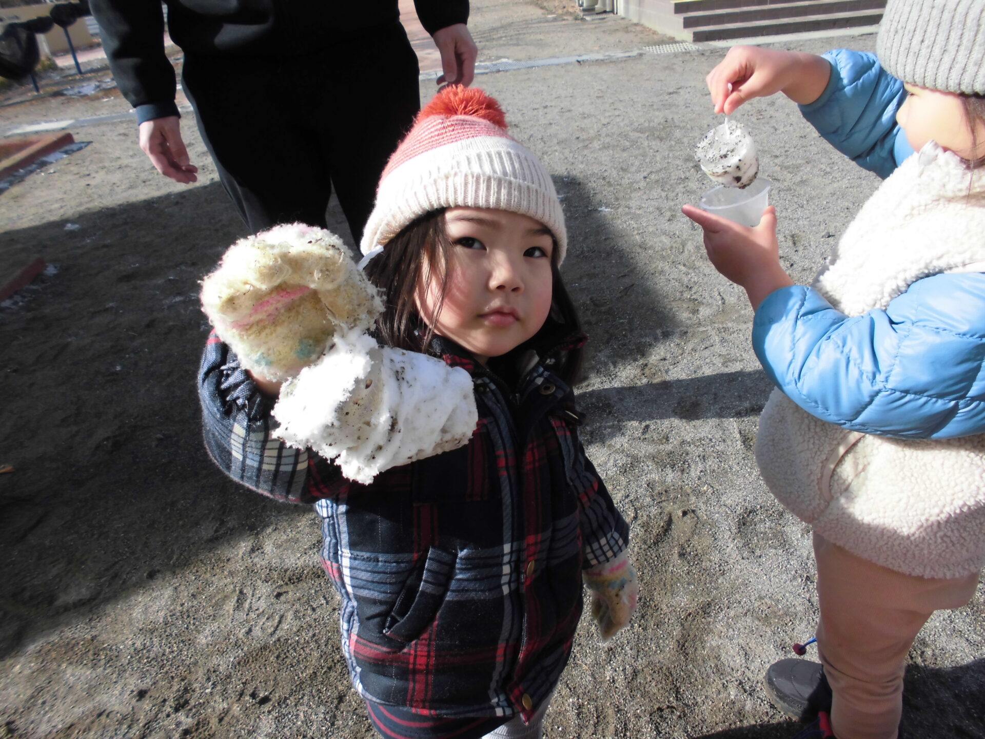 おひさまに透かしてみたり、その上に雪をのせてプリンにしたり、周りに砂をつけてお団子みたいにしてもみました。