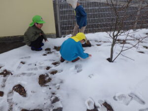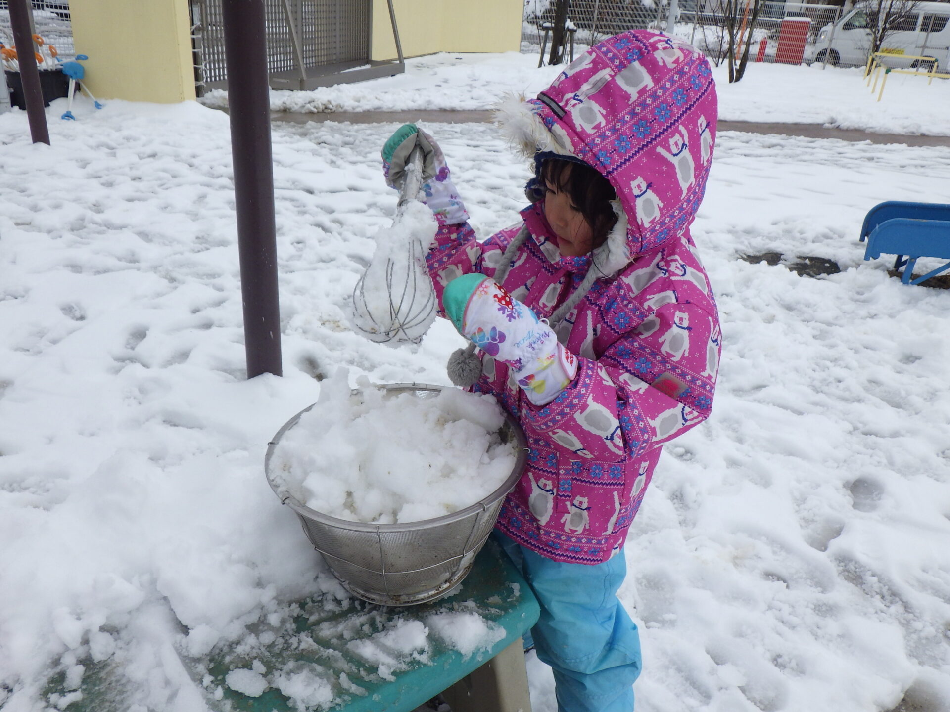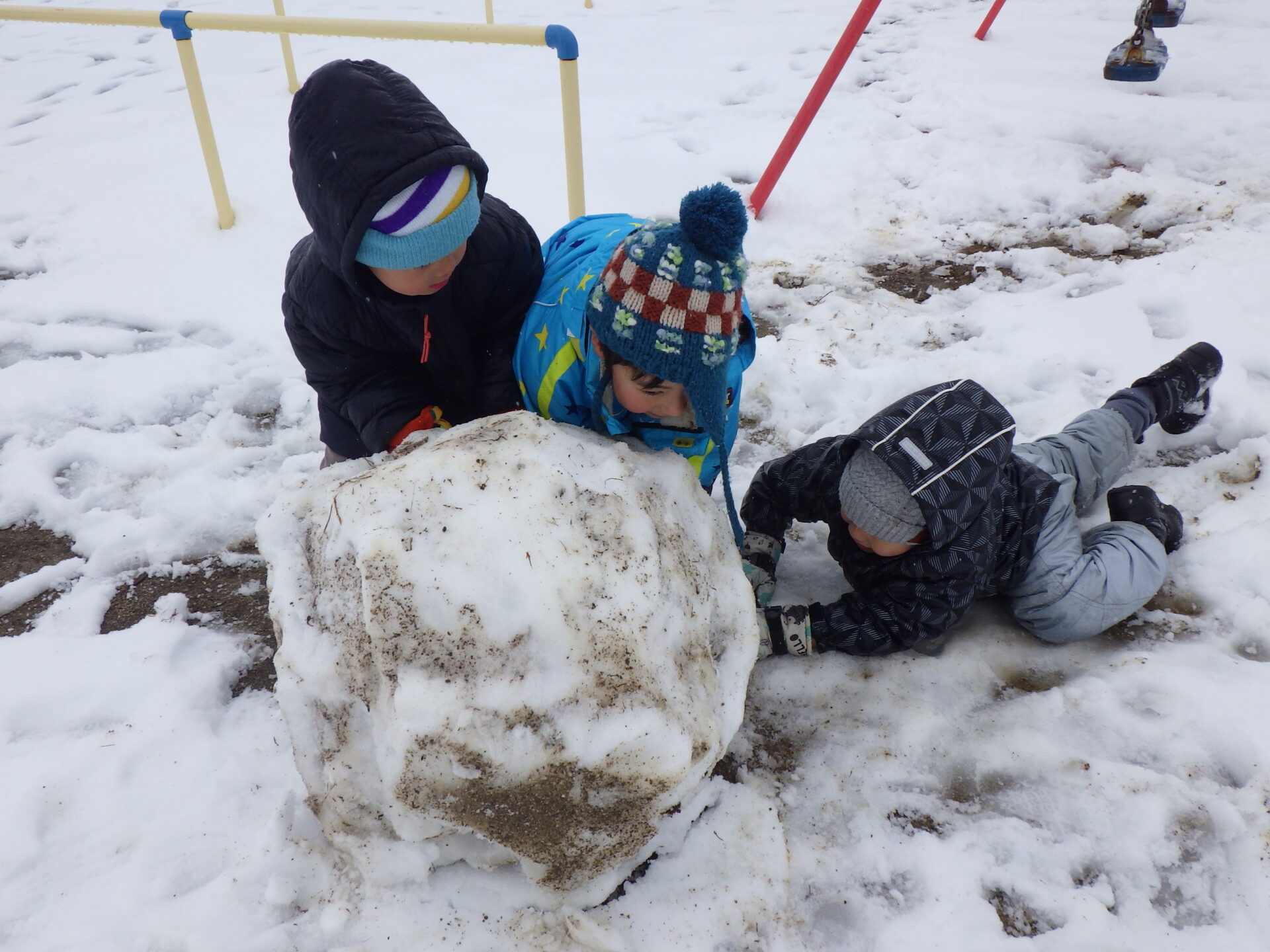 雪をクリームに見立て、友だちと共通のイメージで一緒にあそんだり、大きくなった雪玉を友だちと協力して、もっと大きくしてみようとしたり、雪遊びを通して友だちと思いを共有してあそぶ楽しさを経験していると感じました。