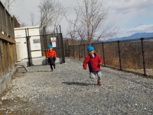 メガソーラーのお家からは川路や天竜川、対岸の龍江までが一望できます。川路保育園も見えるので、恒例の「やっほー!」を~すると、年少年中さんが園庭に出て「おーい!」と応えてくれました。