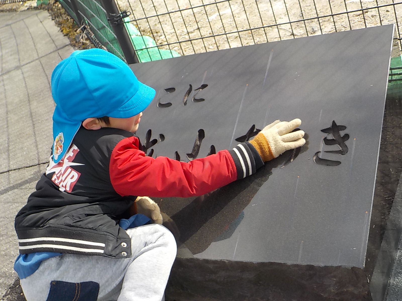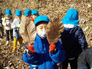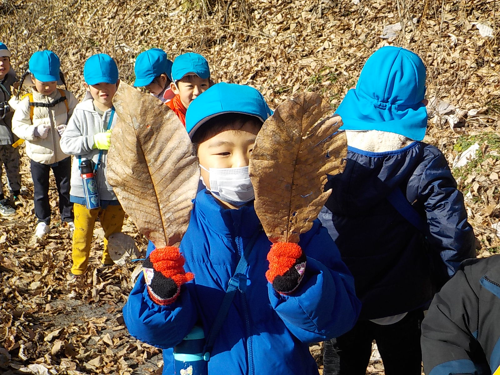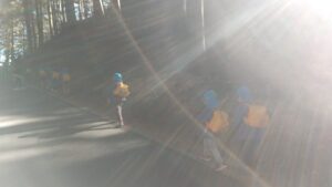 式典からの帰り道、年長さんの背中にお日様パワーが当たっていました。「あ、お日様じゃん!」「ここ(日なた)あったけ~」とお日様パワーを受けて頑張って上り坂を歩きました。