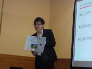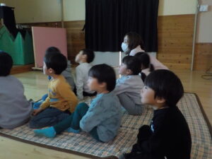 また、電気のお勉強では、電気の先生:中電さんが「言葉が難しいんですよね」と悩みながらも難しい言葉を優しい言葉に置き換えて話してくださいました。子ども達も難しいながらにも「コイル?」「あ、川路のとこ(メガソーラー)」とパワーポイントに映し出される映像にくぎ付けになっていました。