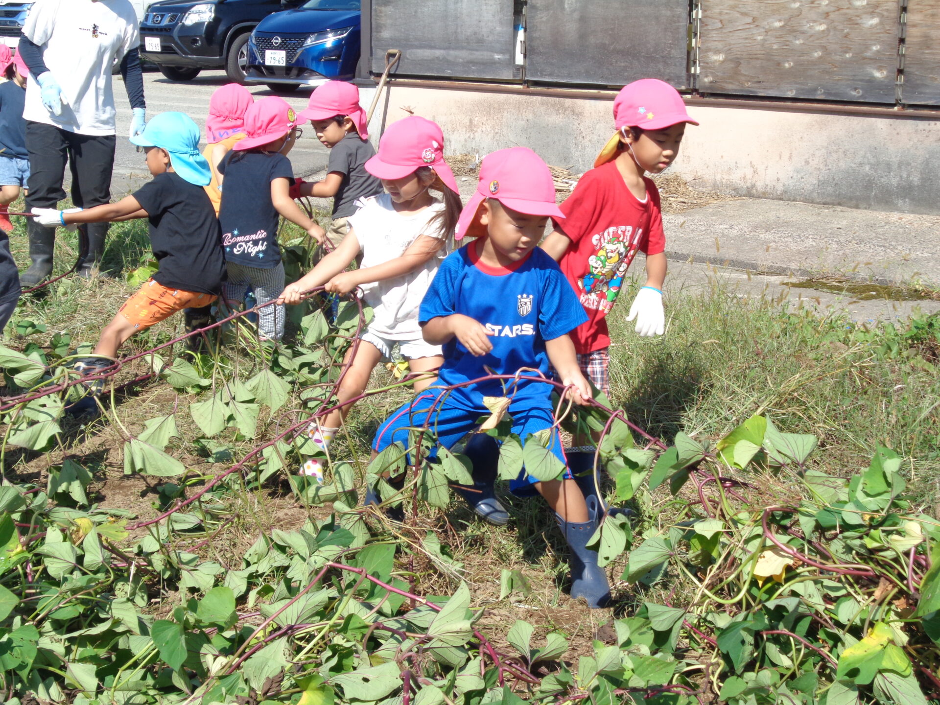 未満児さんは芋掘りの応援に行きました。「がんばってー!!」