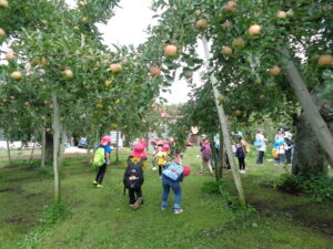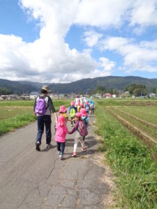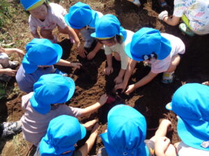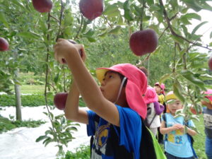 保育園では畑で収穫した野菜で、カレーパーティー、ポップコーンパーティー、やきいもパーティーをしました。また毎年、地域の農園さんのご厚意で『リンゴ狩り』を体験させていただいています。