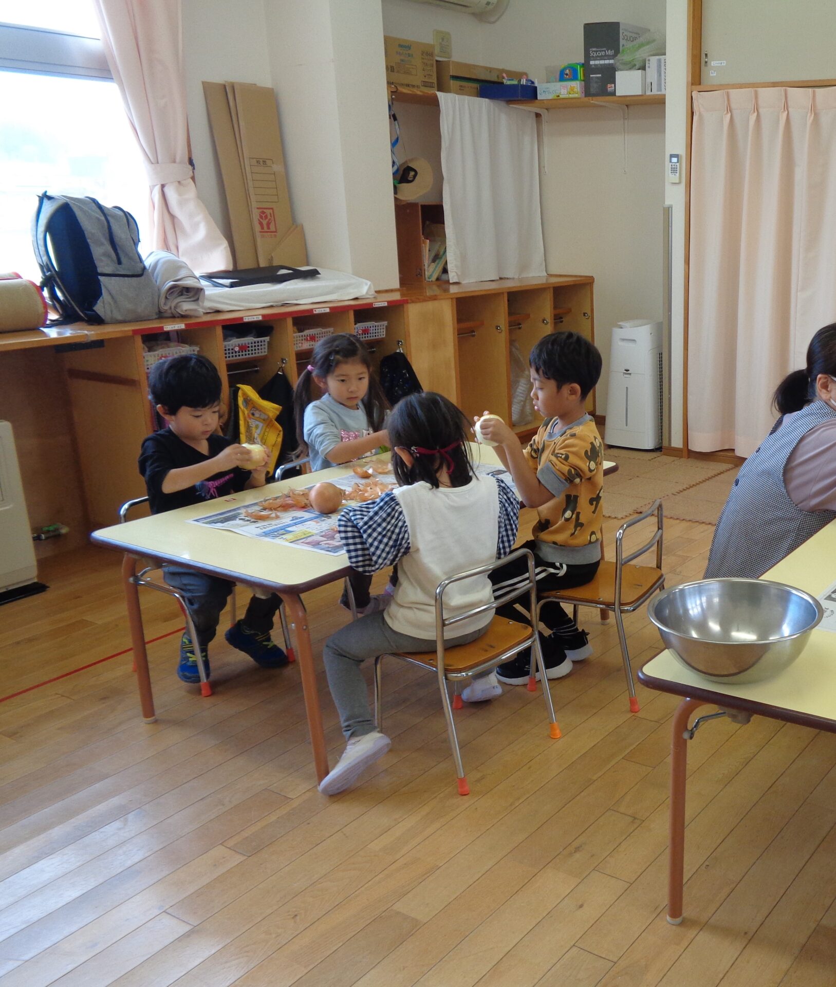 年中さんは、玉ねぎの皮むきに挑戦。
