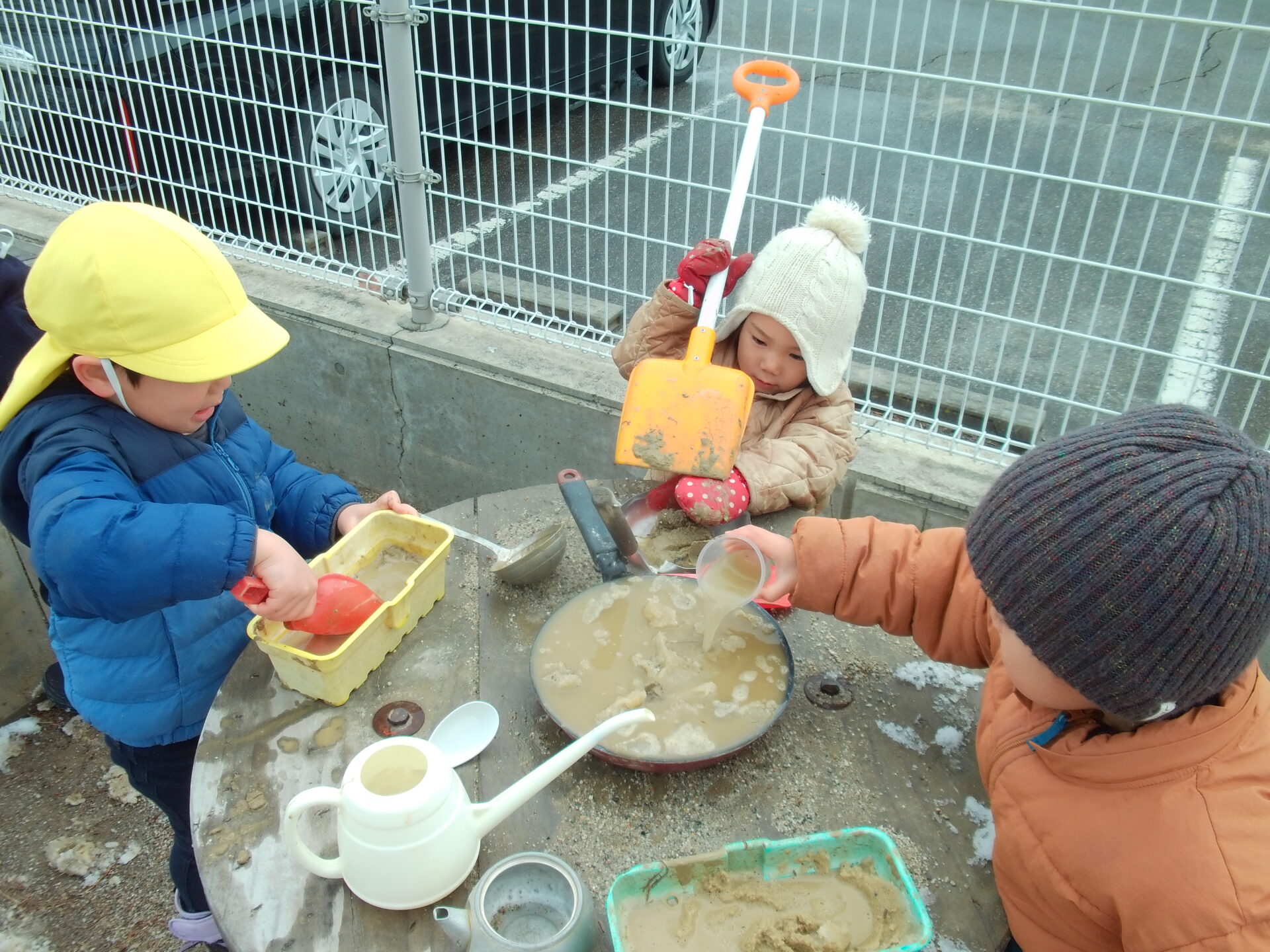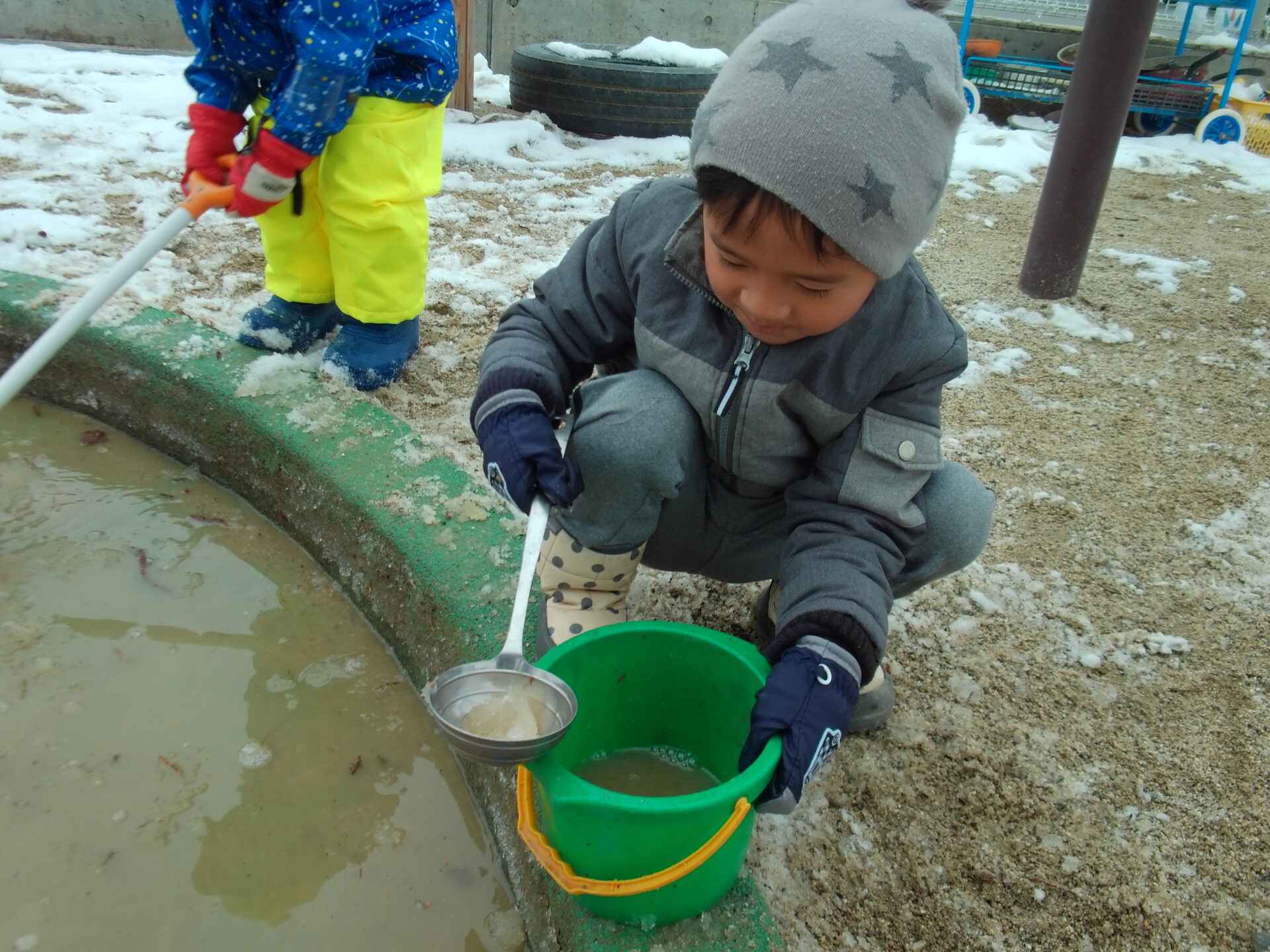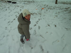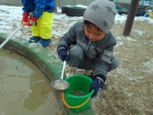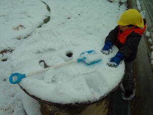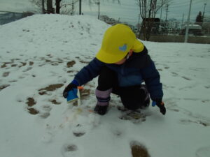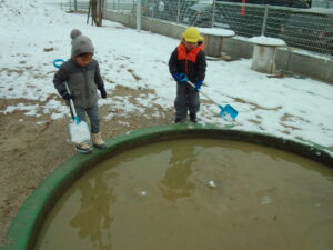 いつもとは違う、真っ白な園庭に「白がいっぱい」と嬉しそうな子どもたち。あそびの中では、「なんで雪は溶けるの?」「どうして水が凍ってるの?」といろんなことに興味を持ちながらあそんでいました。