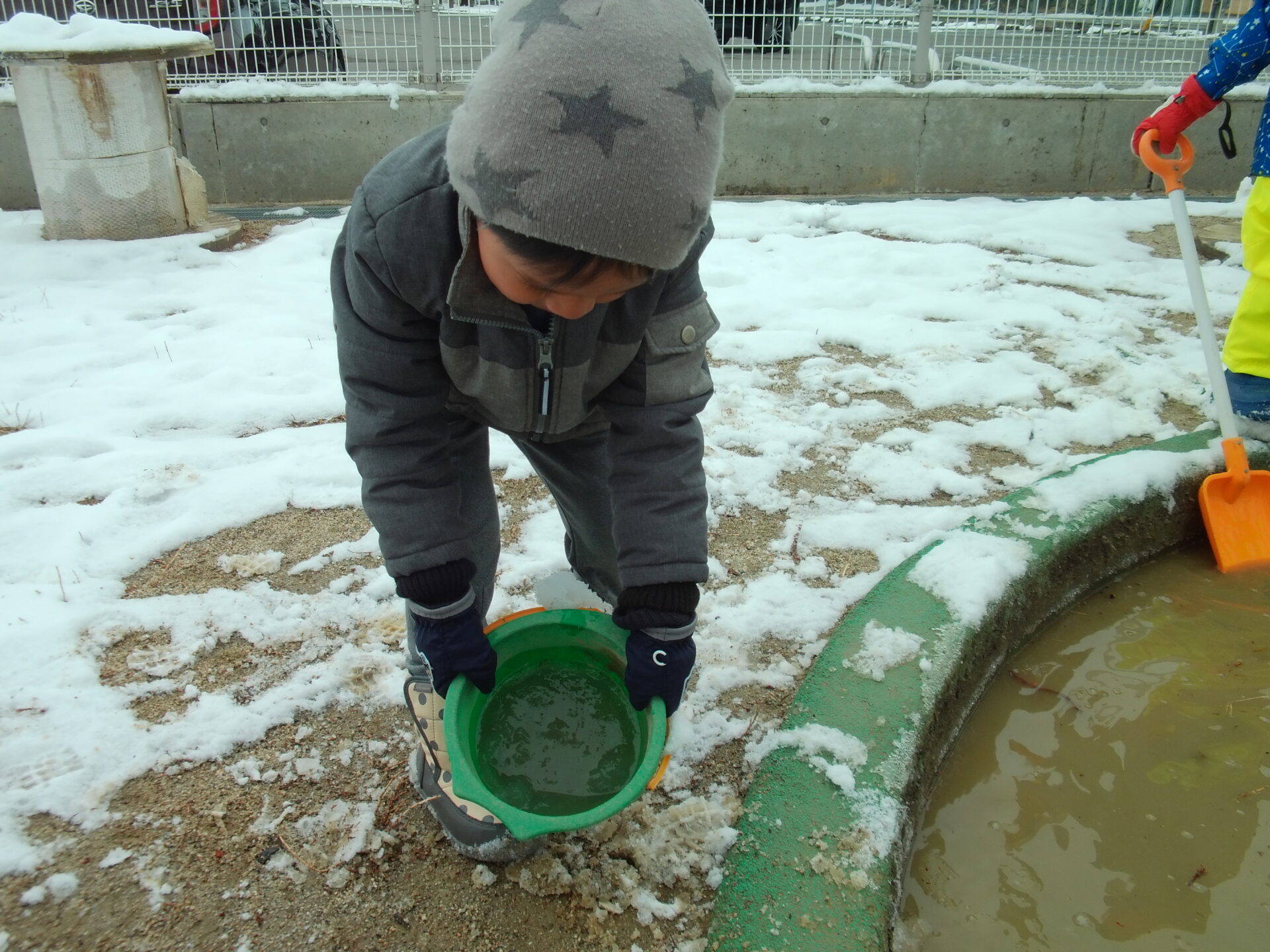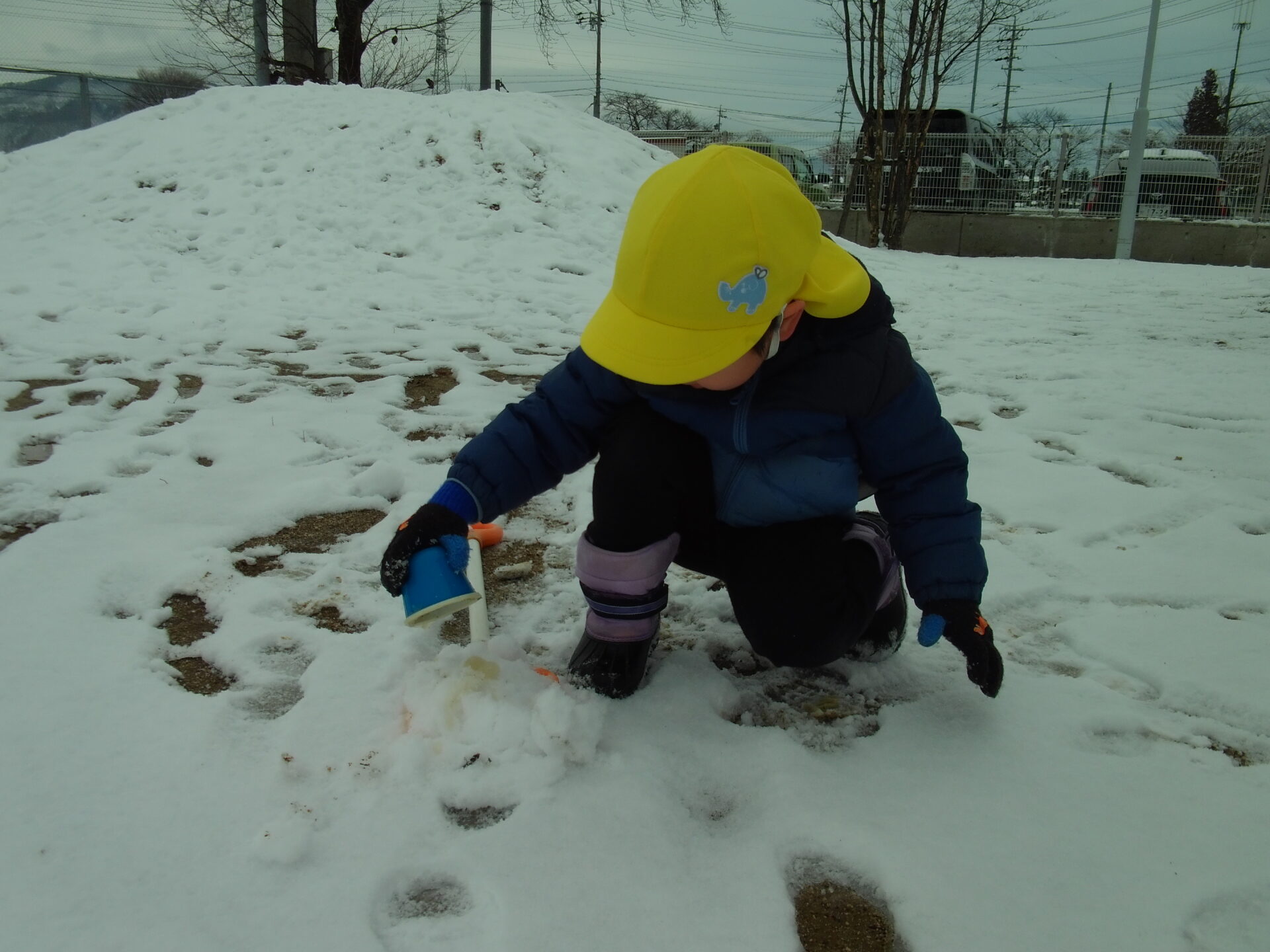 「雪に水かけてみよー」