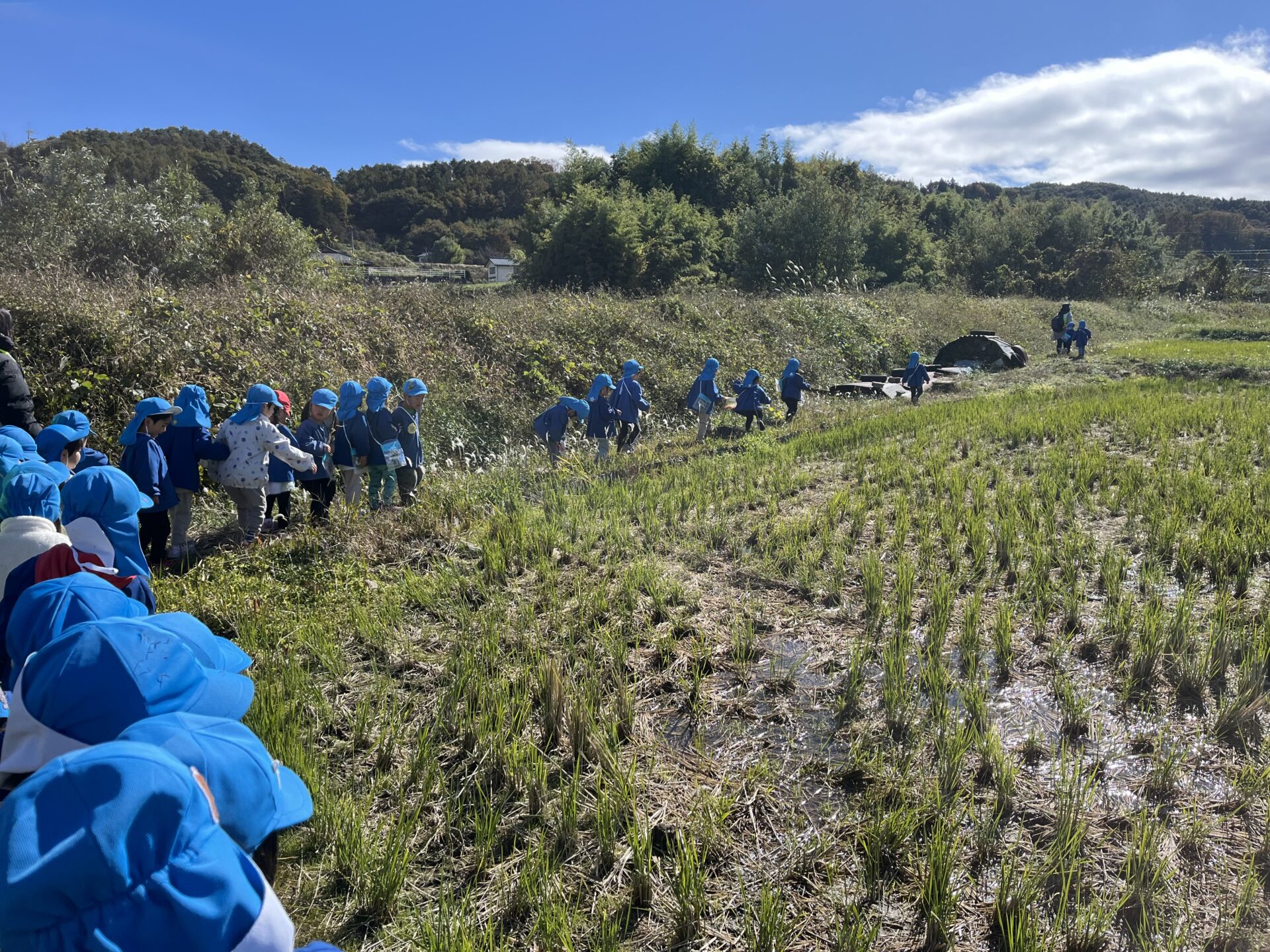 細い田んぼ道を探検し、「落ちる~」とドキドキの子どもたち!