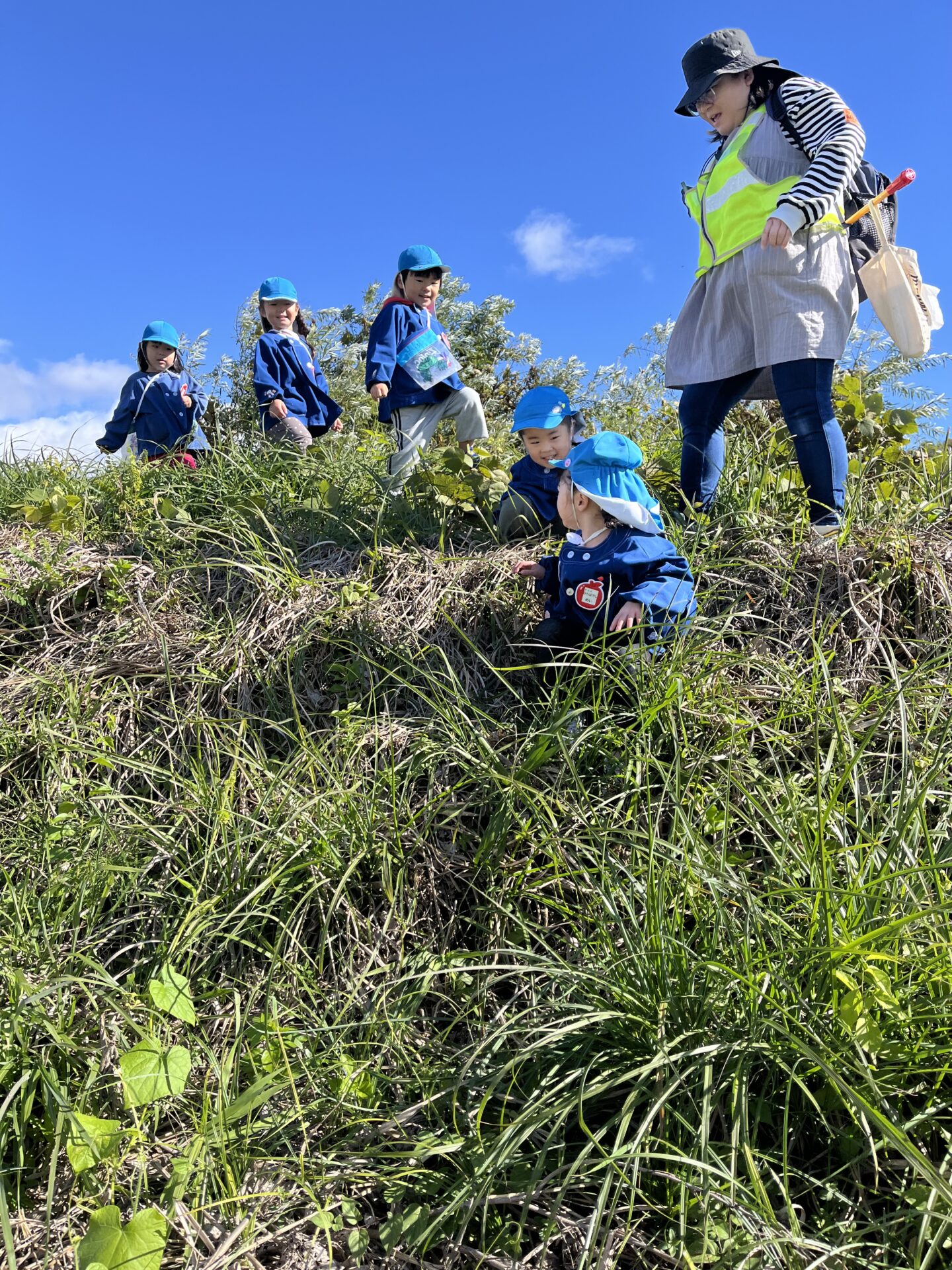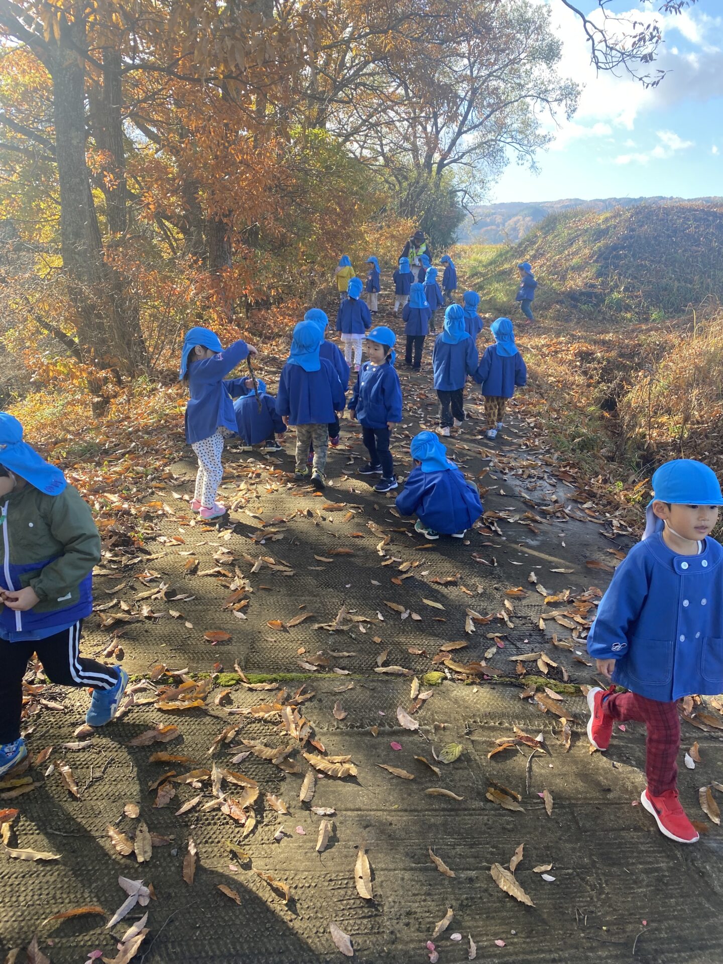 過ごしやすい秋になり、保育園の近くの土手やどんぐり山までお散歩に行きました。