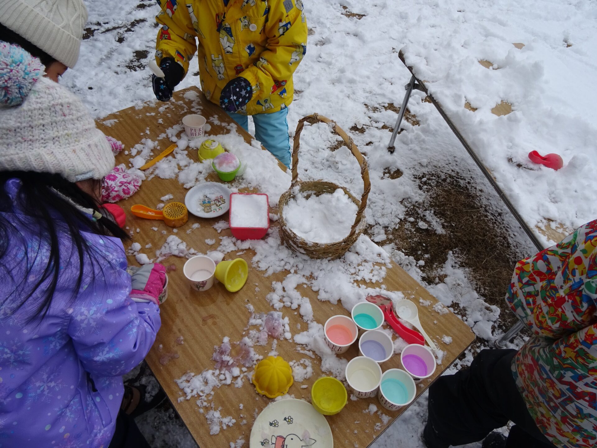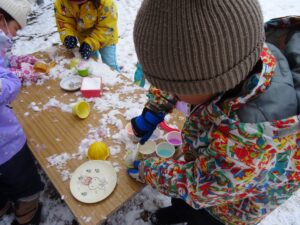 ・雪を丸めたり集めたり踏んでみたり、いろんな遊び方で楽しみます。絵の具を見つけまた遊びが広がり、自然とお店屋さんが始まりました。