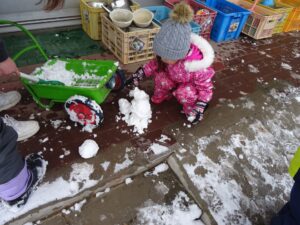 ・子どもたちが待ちに待っていた雪!朝からソワソワしながら窓の外を眺めていました。「雪がやんだら外にいけるかな?」そんな一言をよく聞いていて、雪がやむと嬉しそうに支度をします。