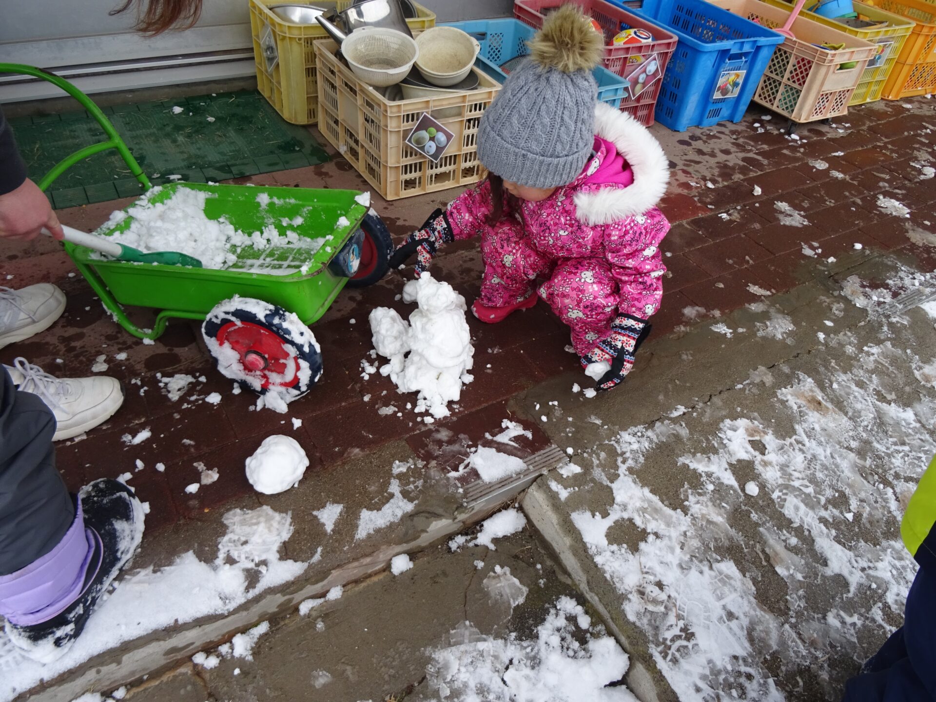 ・今年は雪が少なくなかなか雪遊びをする機会がありませんでした。子どもたちが待ちわびていた雪が降り、登園時からワクワクです。子どもたちの素直な「遊びたい!」気持ちはいつでも楽しそうで、こちらまでワクワクしてきます。