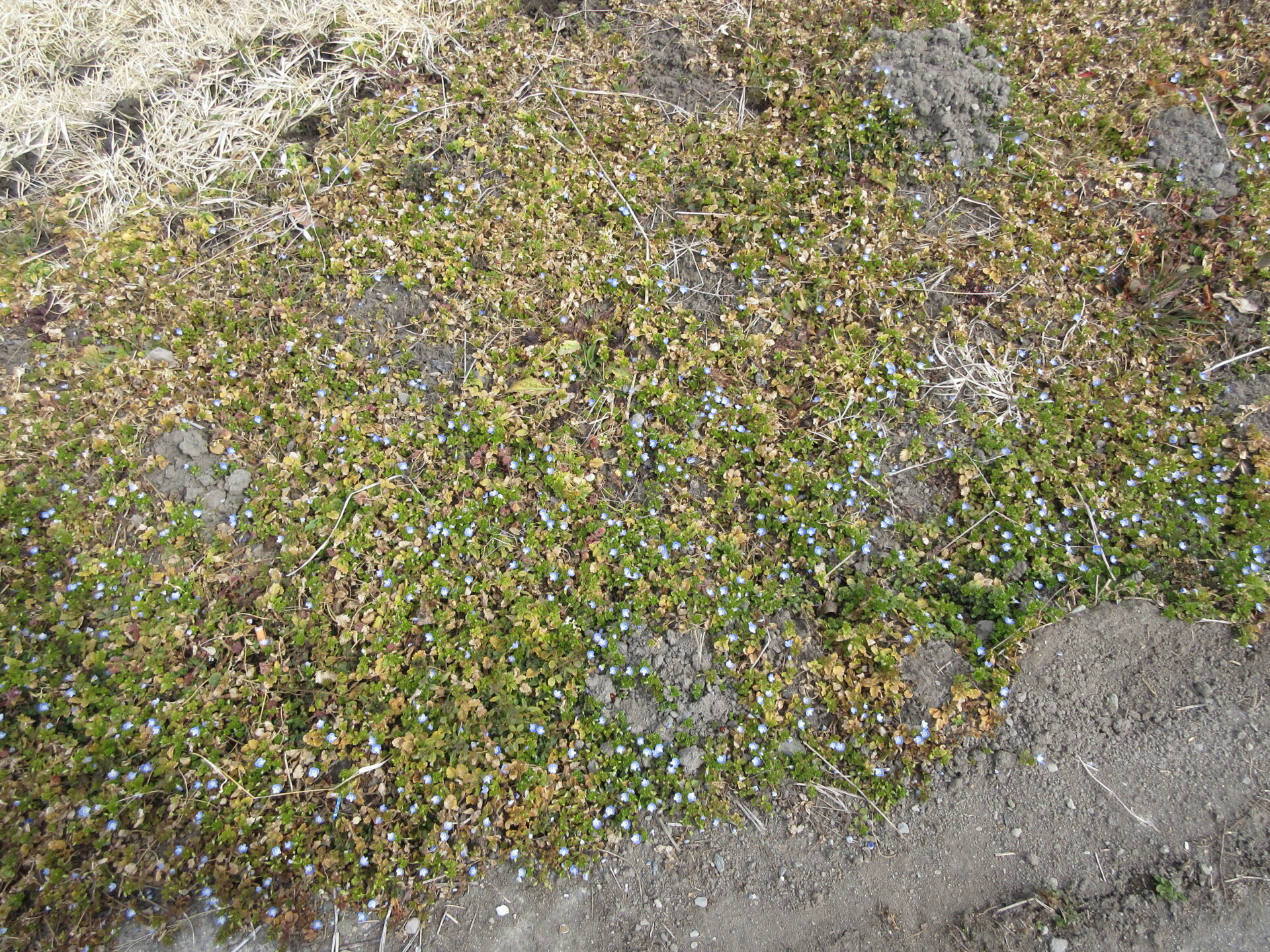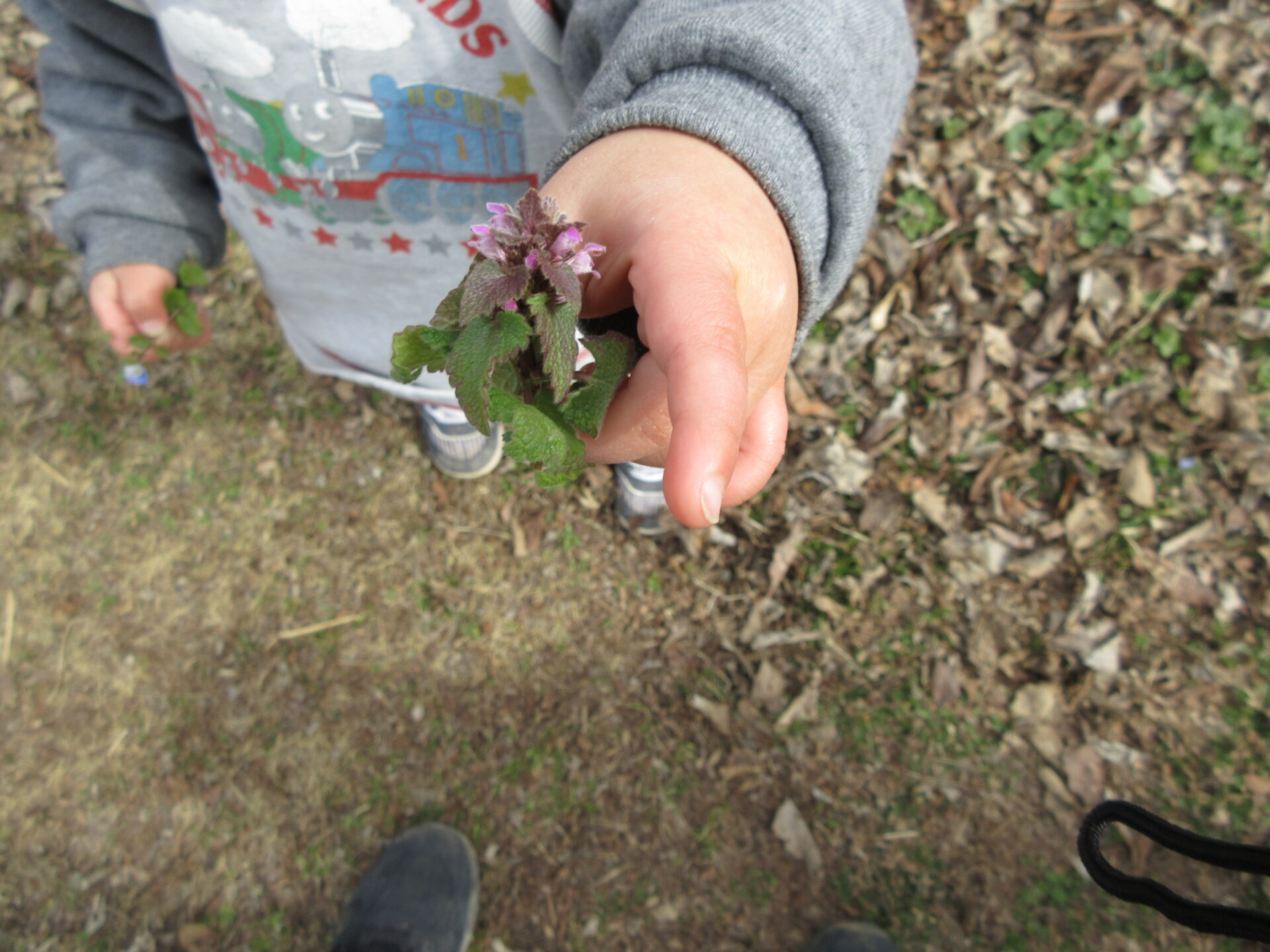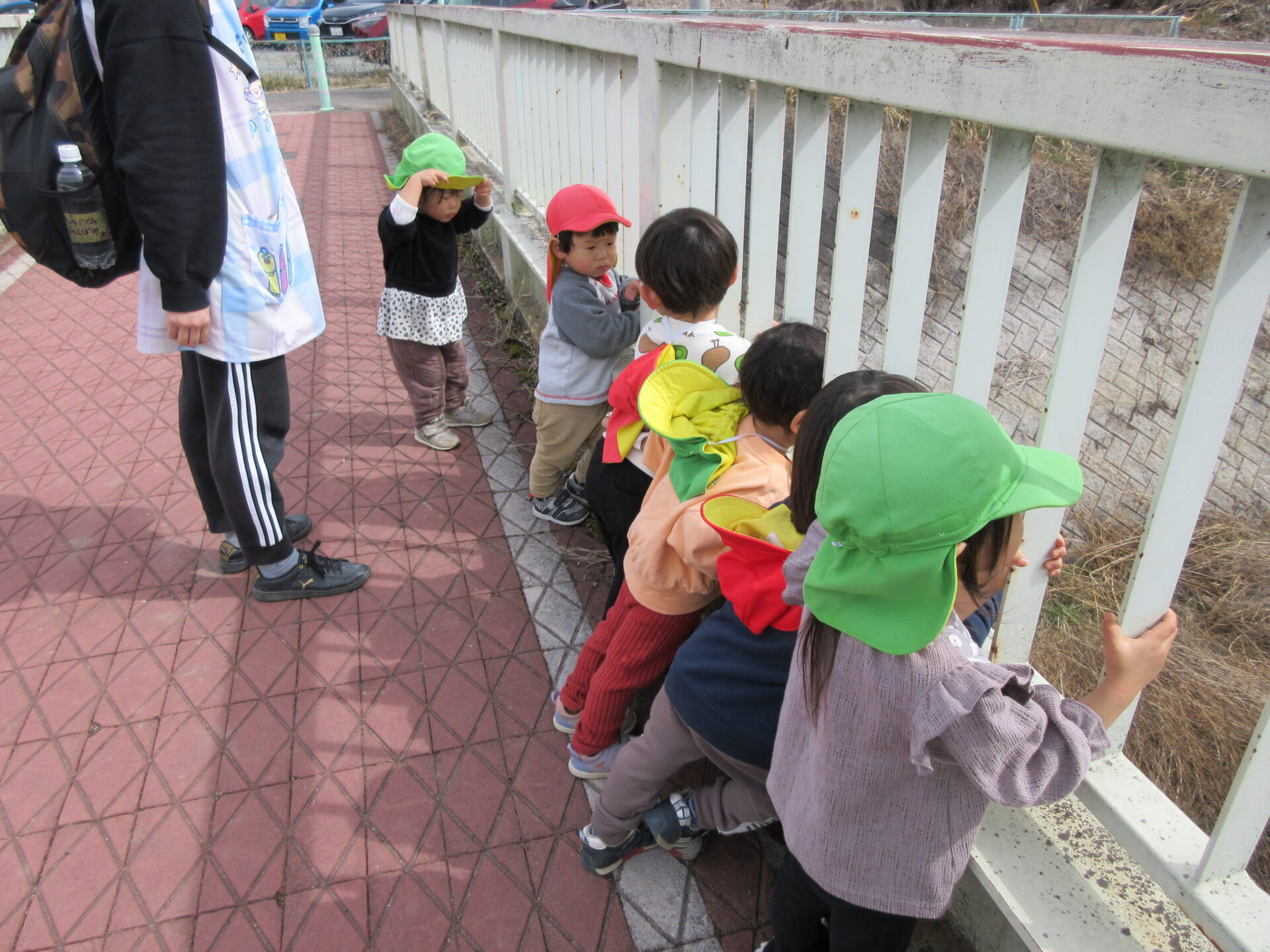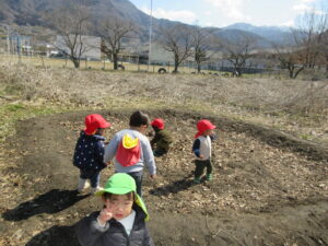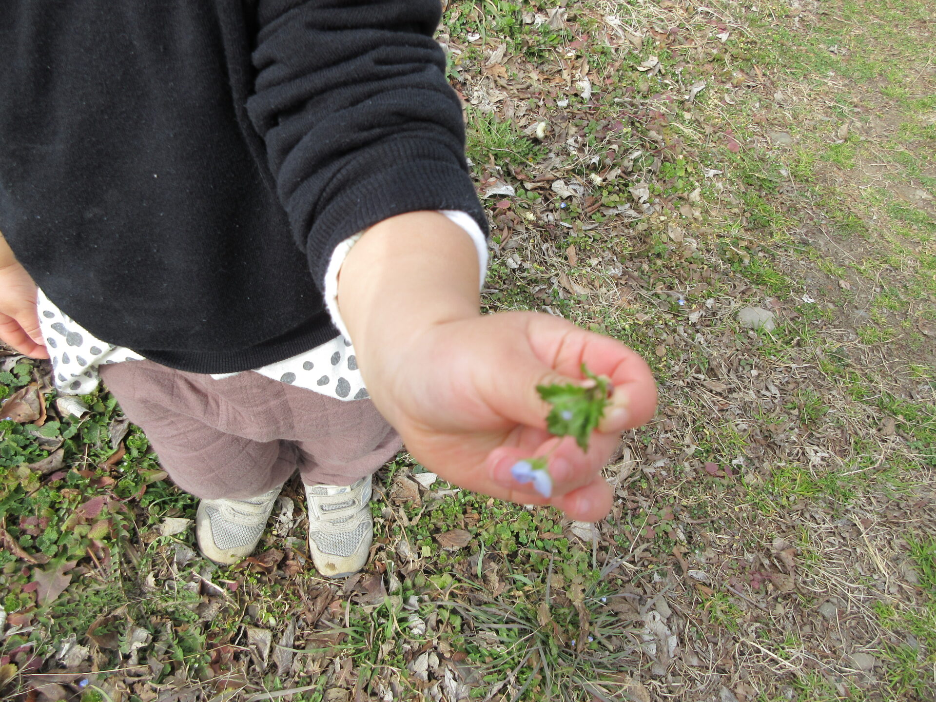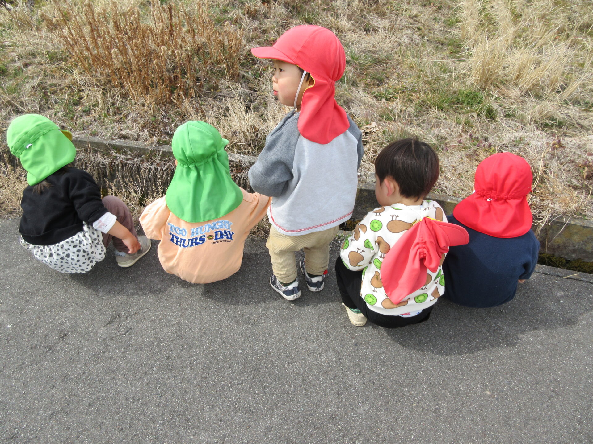 (未満児)日差しや風が暖かくなり、オオイヌノフグリやヒメオドリコソウなどの馴染みのある草花が小さな花を咲かせていたり、梅の蕾が膨らんでもうすぐ花が開きそうになっていたりしているのを発見した。