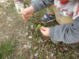 (未満児)五感で春の訪れを感じ、保育士や友達と一緒に見つけた小さな春の自然を楽しんで欲しい。