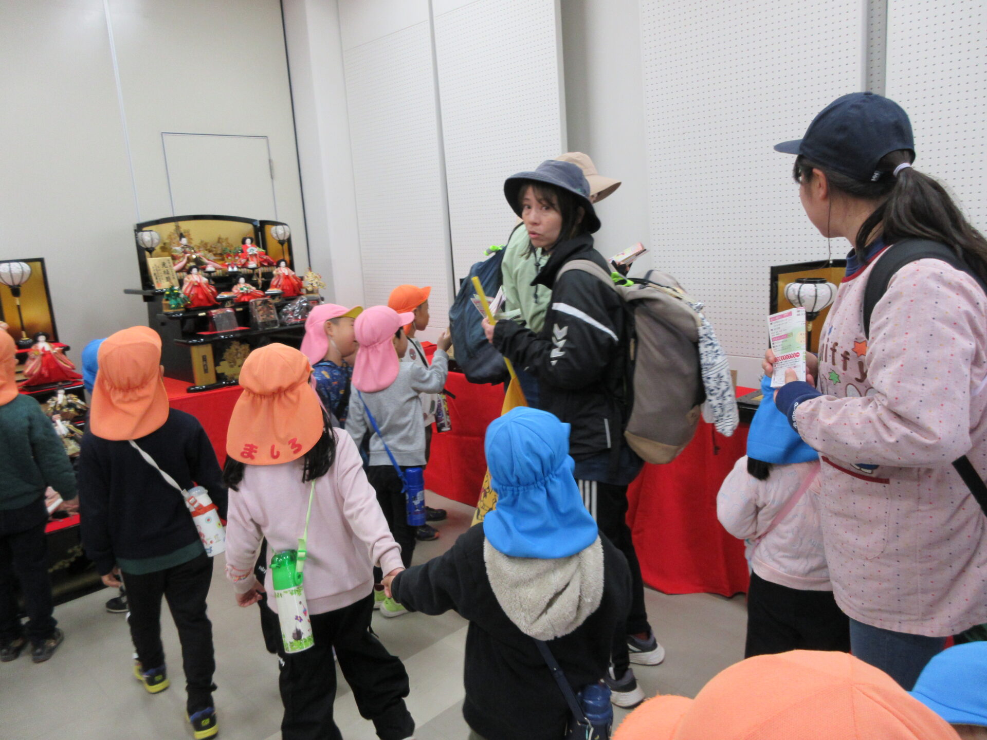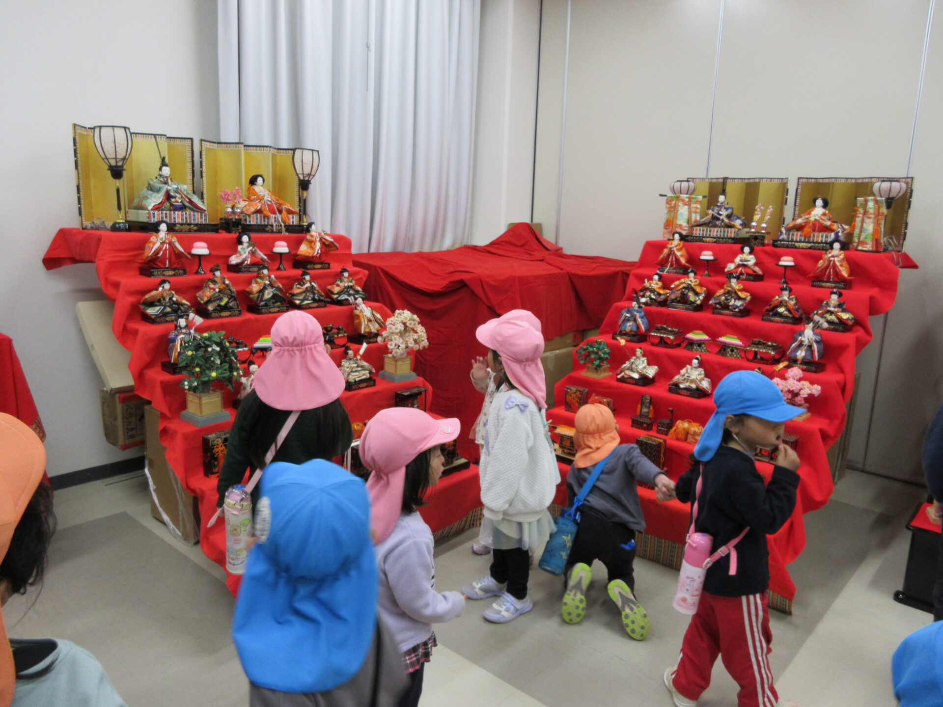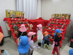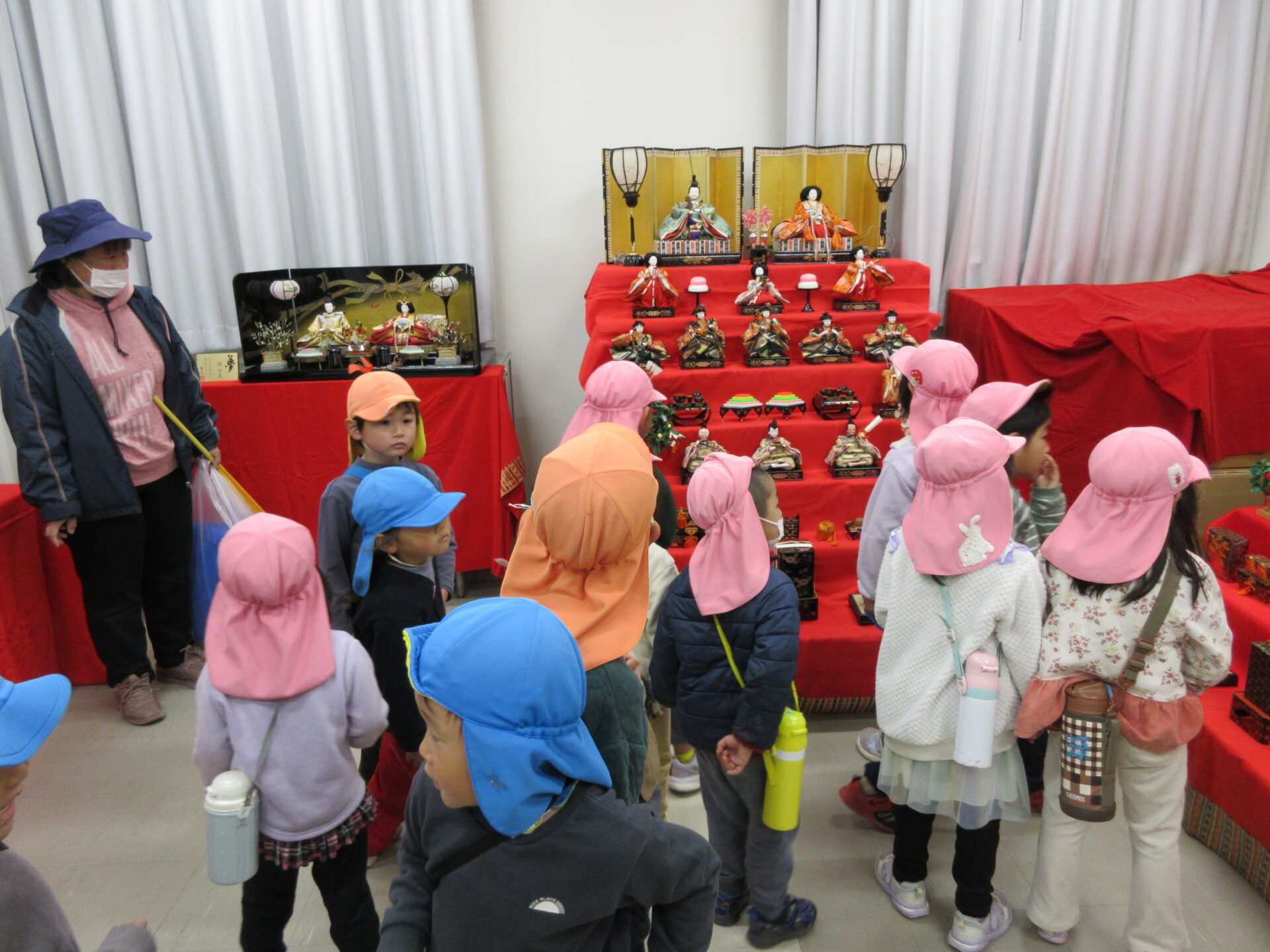 (幼児)町の中に飾られているおひな様を見つけることを楽しんだり、それぞれのおひな様の着物や表情、飾られ方などに興味を持ち、違いに気づいて欲しい。