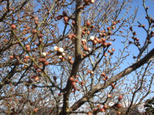 梅の蕾もこんなに膨らんで、咲き始めているものもちらほら。