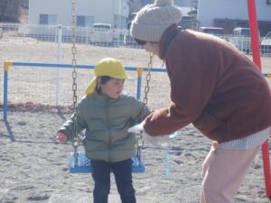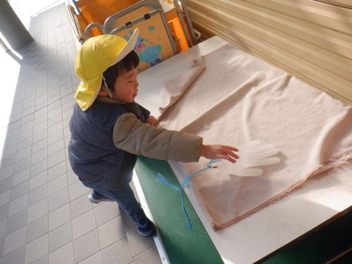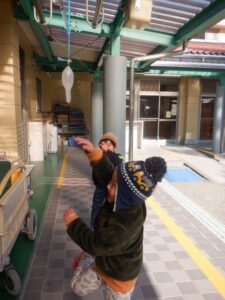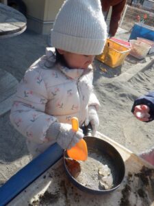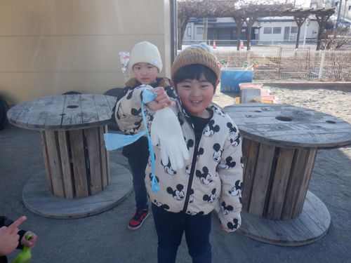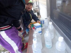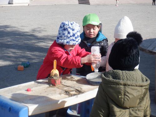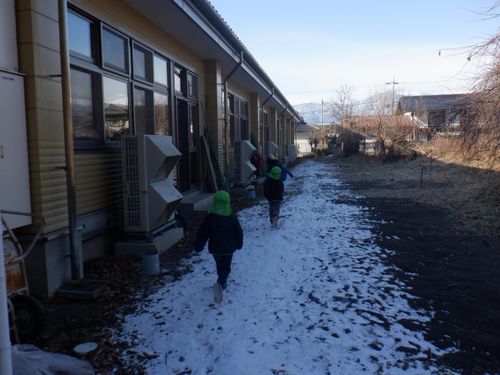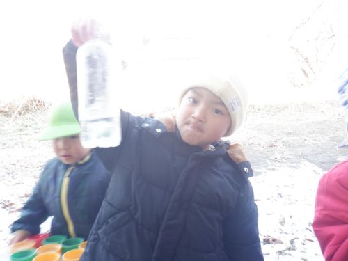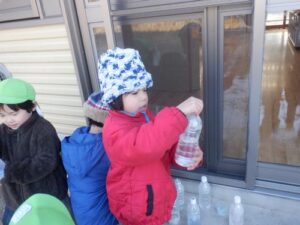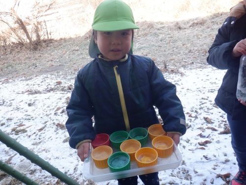 前日に明日はとても寒いことを聞いた子どもたち。「氷作りたい!」年長さんの発信がきっかけとなり、みんなでいろんな容器に水を張ったり色を付けてみたりして、翌日を楽しみに待ちました。見事に氷ができ、氷が楽しい遊びに大活躍してくれました。より凍りやすいのは”寒いところ”と知り、翌日も遊びに使いたいからと言って、元あった北側の畑の方へ戻していました。冬ならではの不思議さ、楽しさにたくさん触れた遊びができました。これだけの寒さは、安曇野ならではだと思います。雪の少ないこの冬でしたが、この時期しかできない体験から、たくさんのことを学んでほしいな、と思いました。