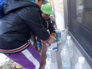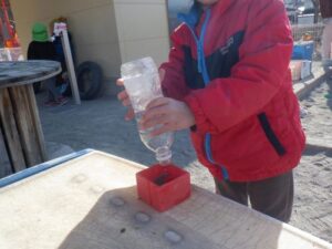 ペットボトルの中で凍った氷をカップに移します。さて、何をするのかな?