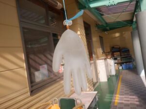 これは、保育士が用意した手袋氷。いろいろな物で、氷が作れることを知ってほしいと思い、手袋氷を作ってみました。