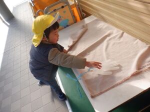 「これさー、むこう(南側の園庭)に持っていって遊ぼうよ!」早速、使いみちを思いついた子どもたち。