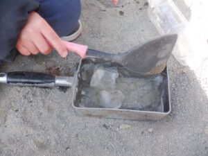 月曜日の帰りに、祝日の休み明け、氷で遊べるように北側の畑に氷の準備をしていったみんな。