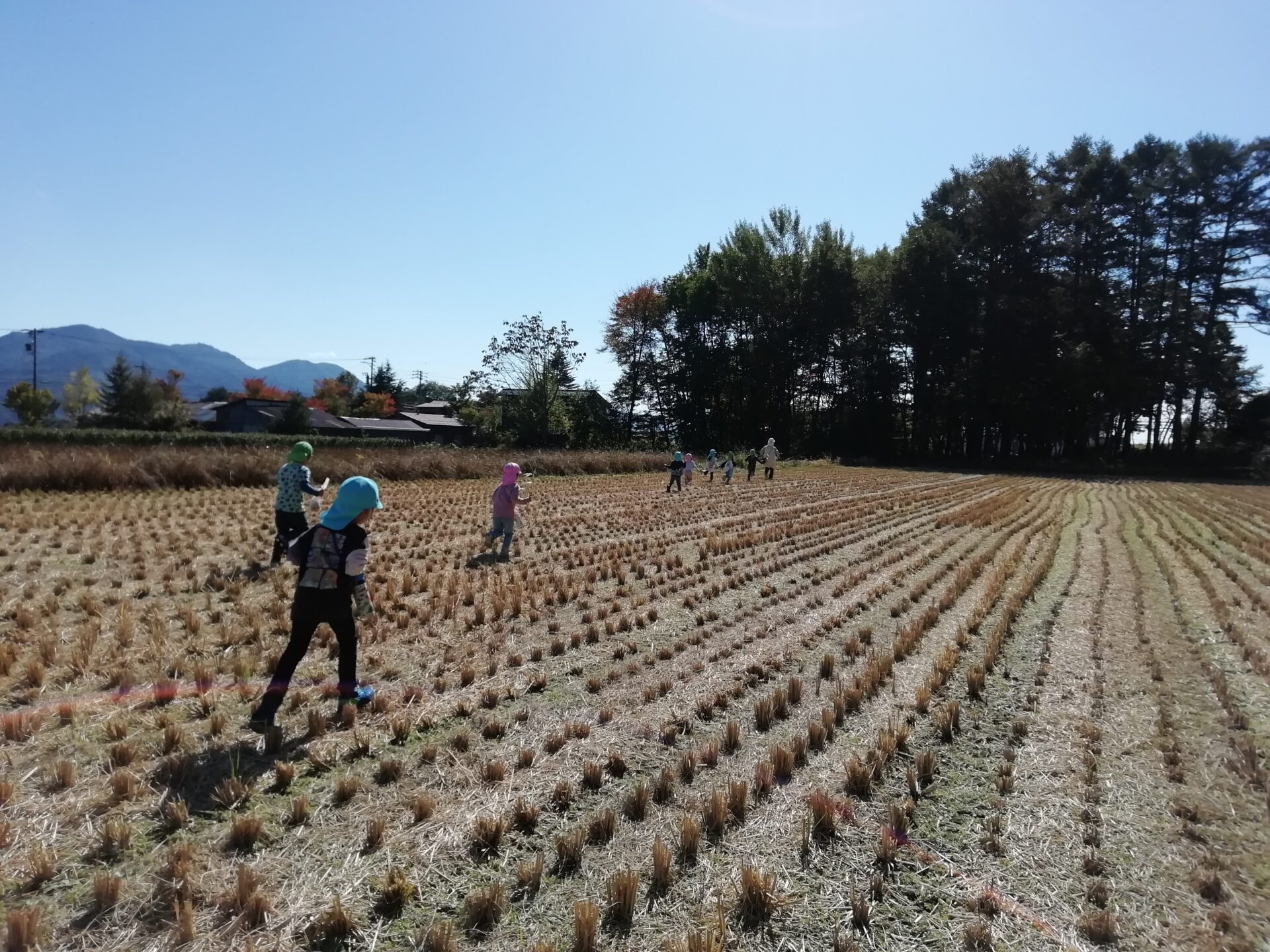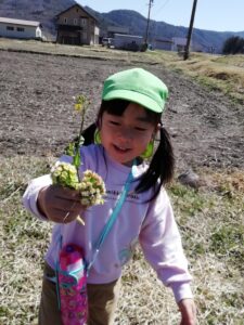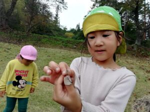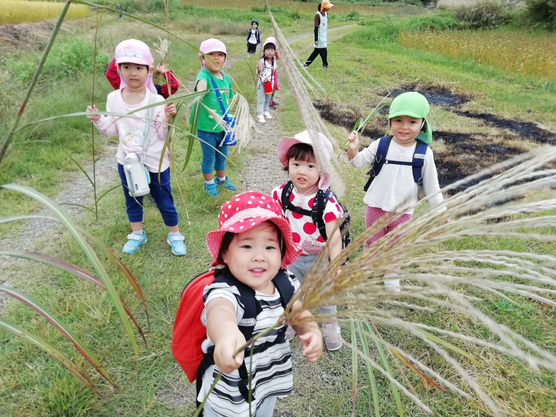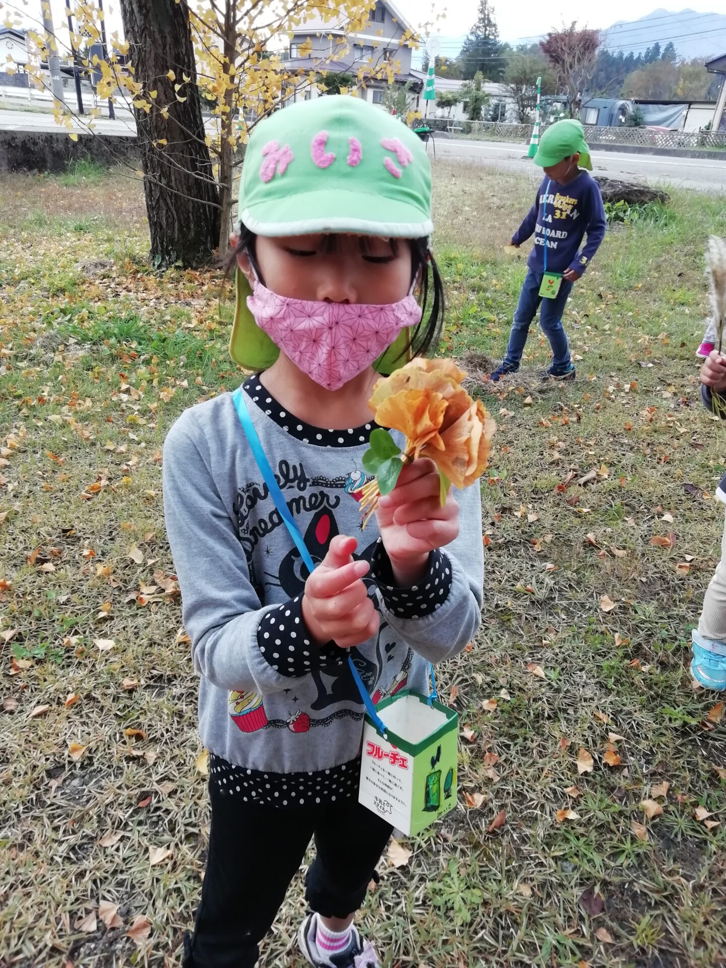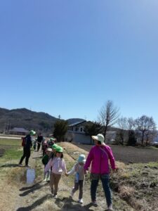 それが、秋冬になると、「今日はどこに行く?」「あっちの方も面白そうだよ」と自分たちで楽しそうな場所を散策したり、未満児さんも加わって、「車が通る方は危ないから私が歩くよ」と年下の子を面倒見る姿が多くなりました。