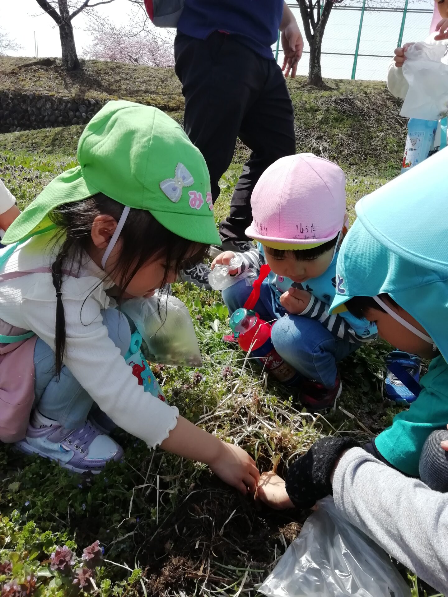 春にお散歩にでかけたときは、年少さんは年長さんのお兄さんお姉さんに手をつないでもらい、いろいろな場所へでかけましたが、「疲れた〜」「まだ〜?」という声も聞こえました。