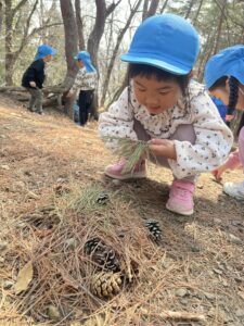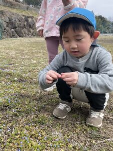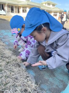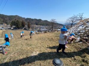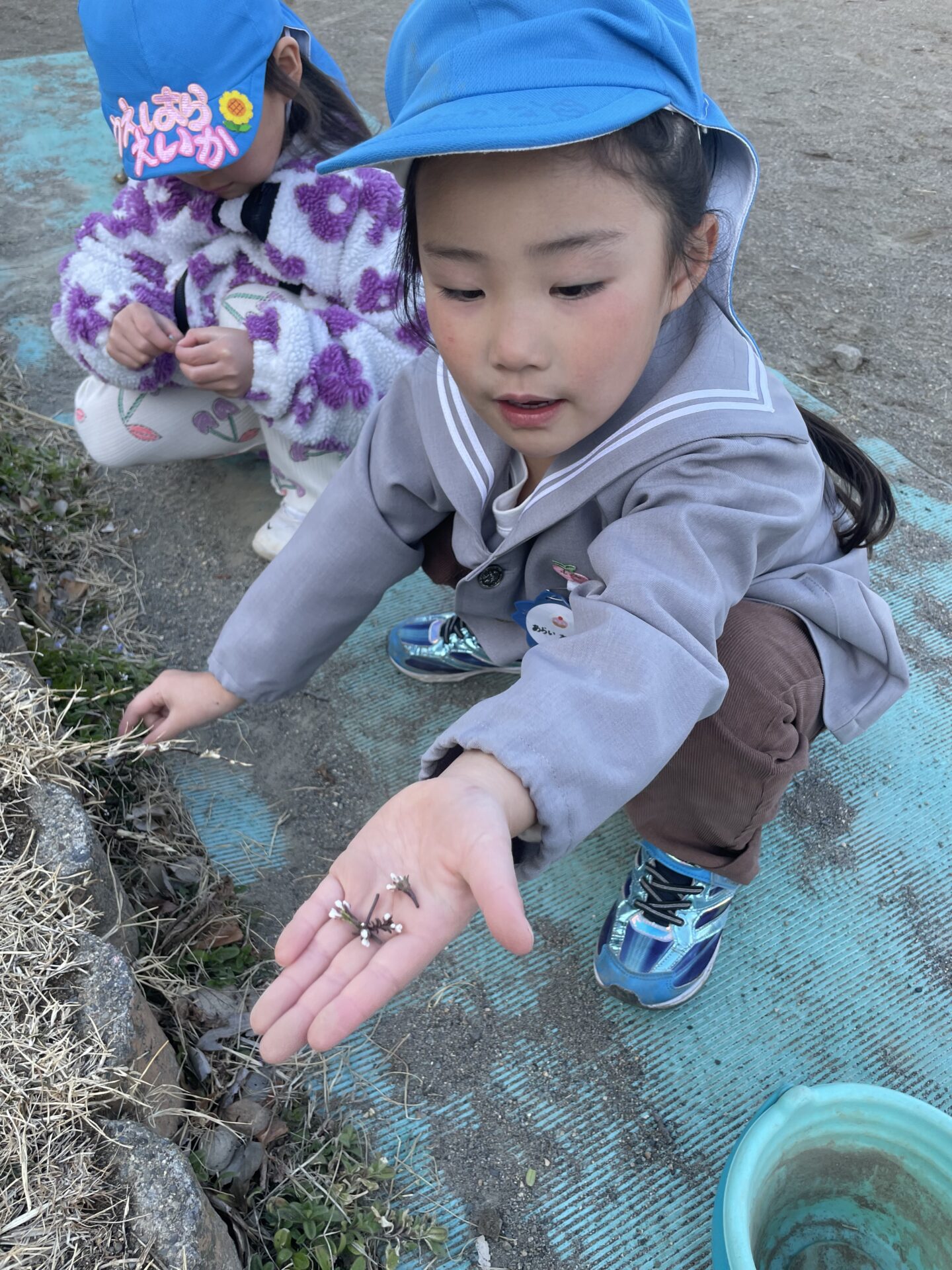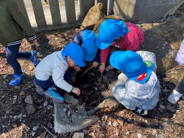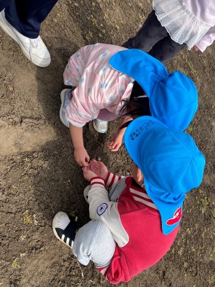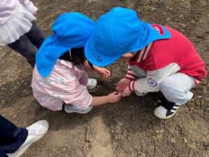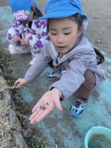 この一年間で出来ることがたくさん増えた子どもたち。〇〇に行きたい!△△して遊びたい!と自らやりたいことを見つけられるようになってきました。たくさんの自然物と触れ合う中で、生き物の大切さや植物の成長を、身をもって学ぶことで遊びが深まっていく様子も見られました。