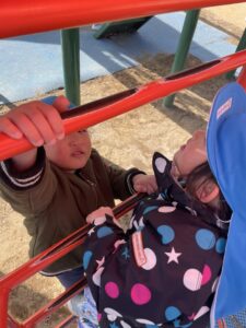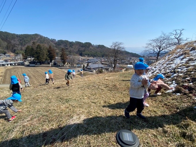 この日は日差しもあり、朝から暖かく、絶好のお散歩日和…ということで、皆が大好きなふるさと公園に行ってきました。保育園から少し距離があるため、年少さんはまだ行ったことがなく、無事に着くかな?とドキドキしながら出発しました。