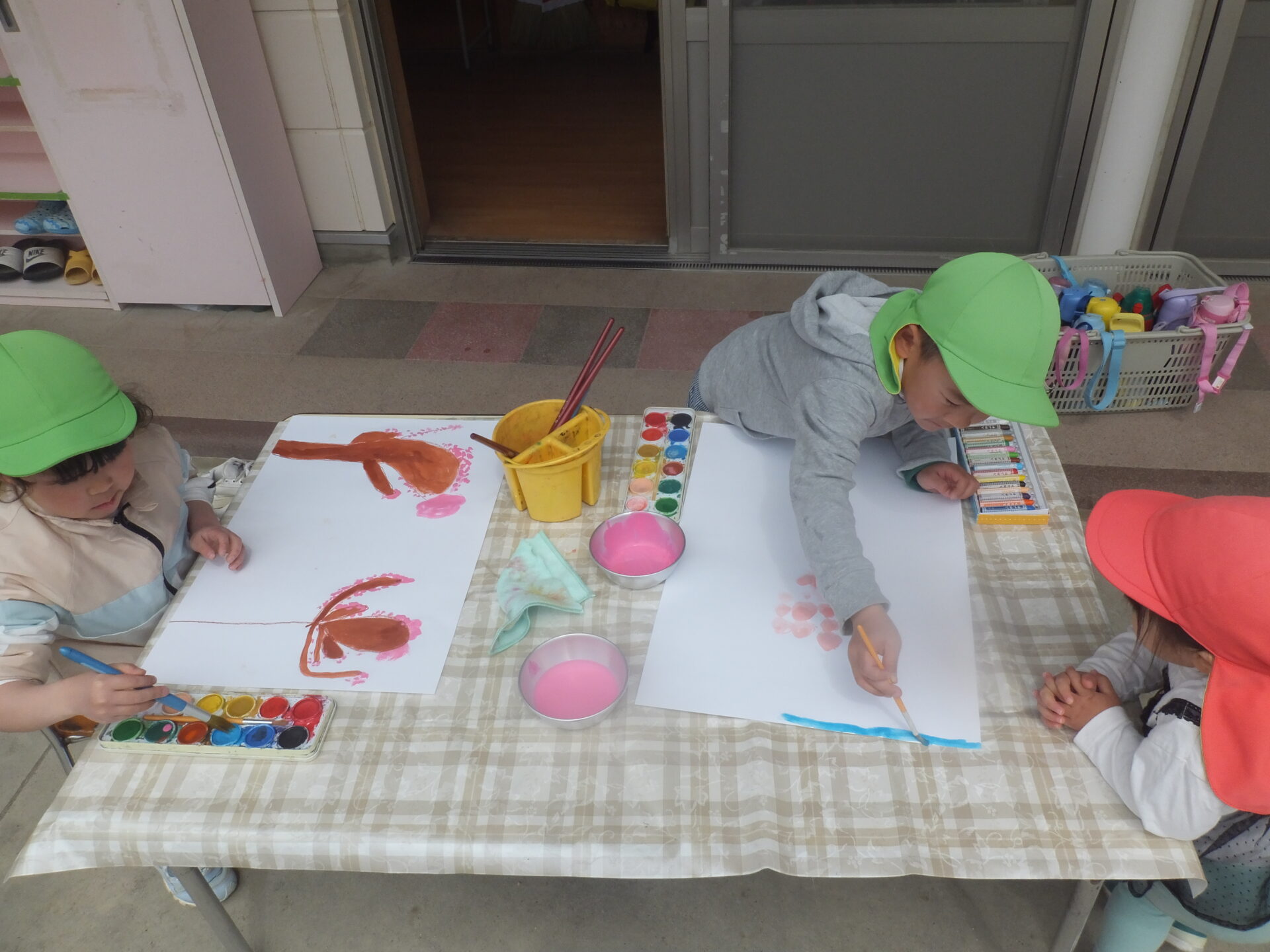 桜の花に親しみを持ってもらいたいと願い、観察して絵を描いてみました。一人一人の感性が光る作品になりました。木と土の色の違いに気付き、塗ろうとする姿には驚きました。