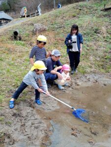 あぜぬりの後は田んぼの散策。オタマジャクシやおけらを捕まえるこどもたち。