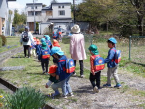 お散歩リュックを背負って年長さんが年少さんと手をつないで歩いていきます。