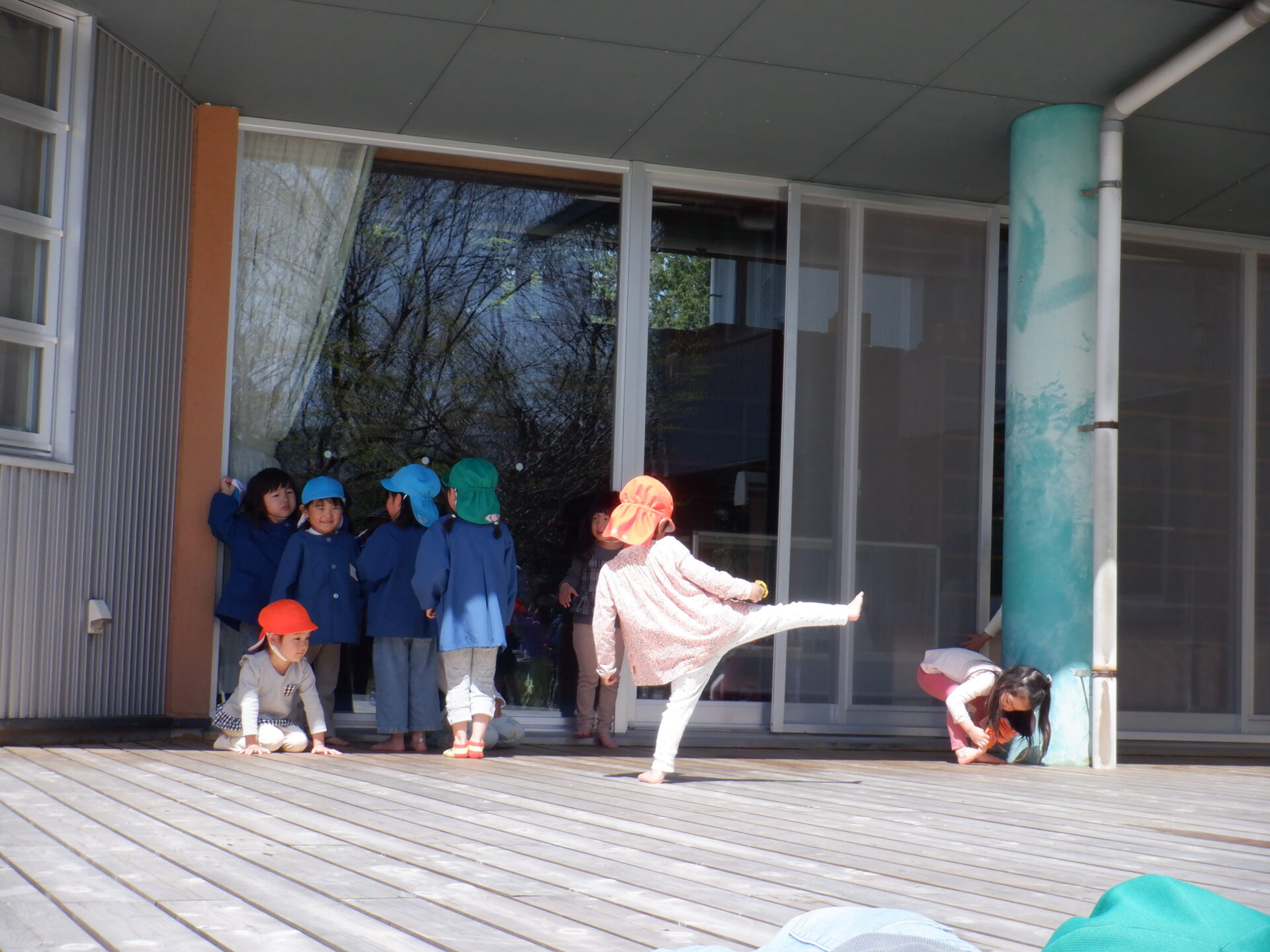春の日差しの中、広いウッドデッキの上はとても気持ちよく、走り回ったり、寝転がったりして遊ばせてもらいました。