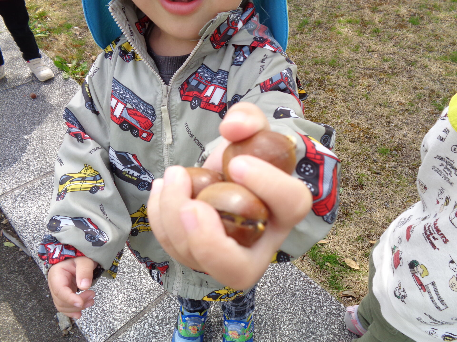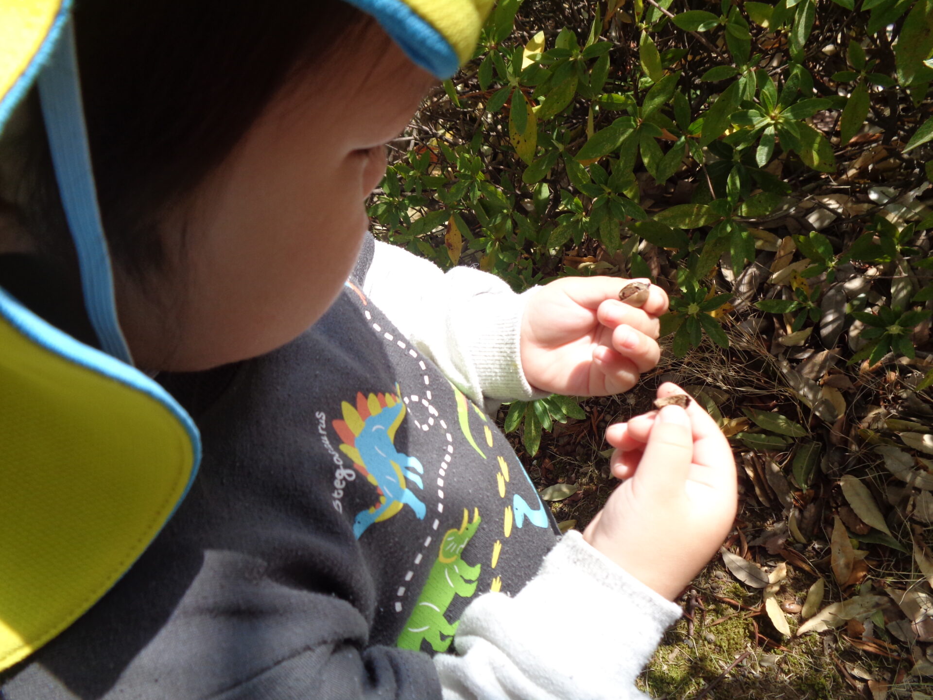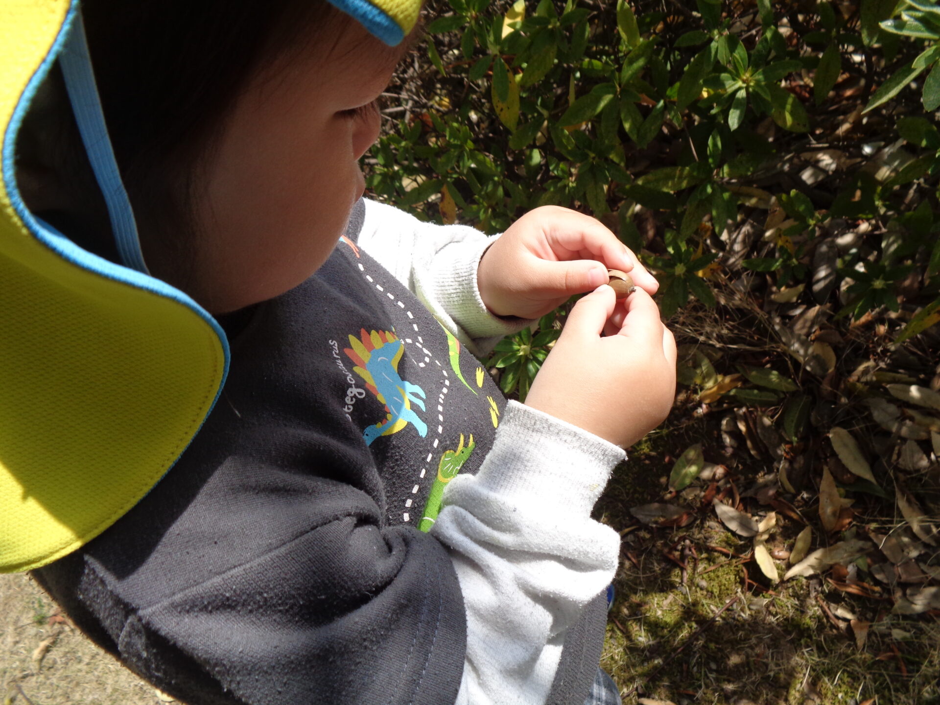ありを見つけたりどんぐりを拾ったり、いいもの探しにみんな夢中です。