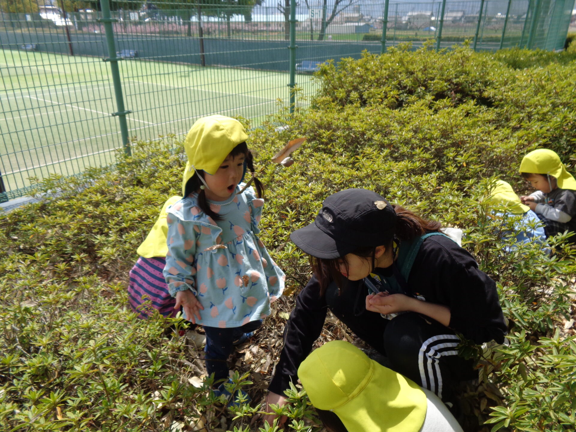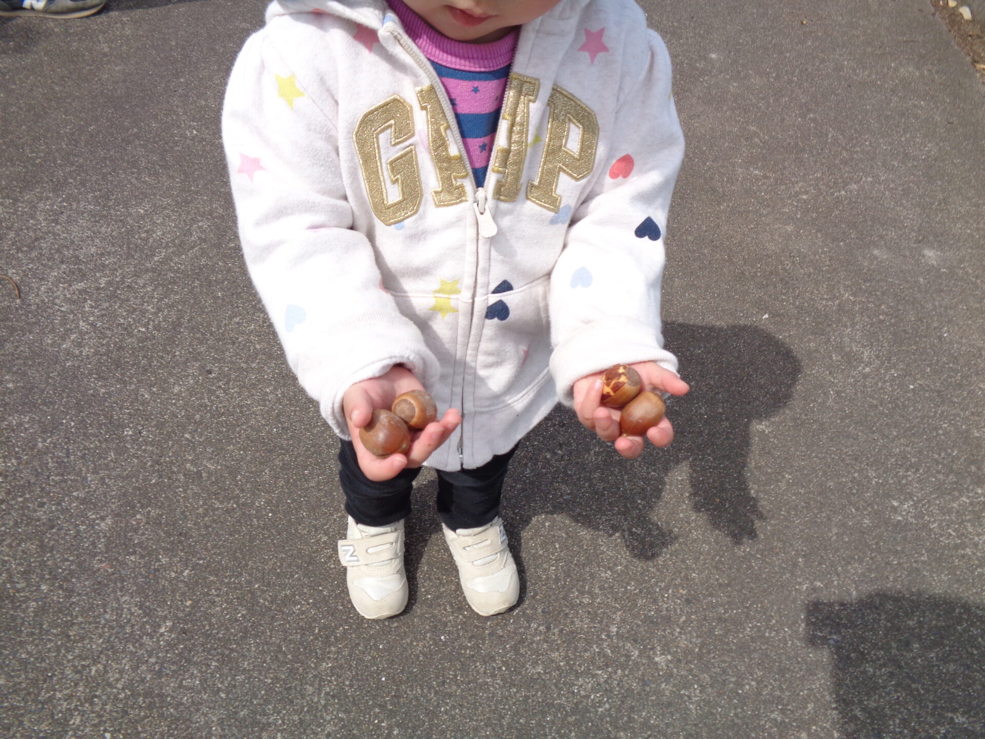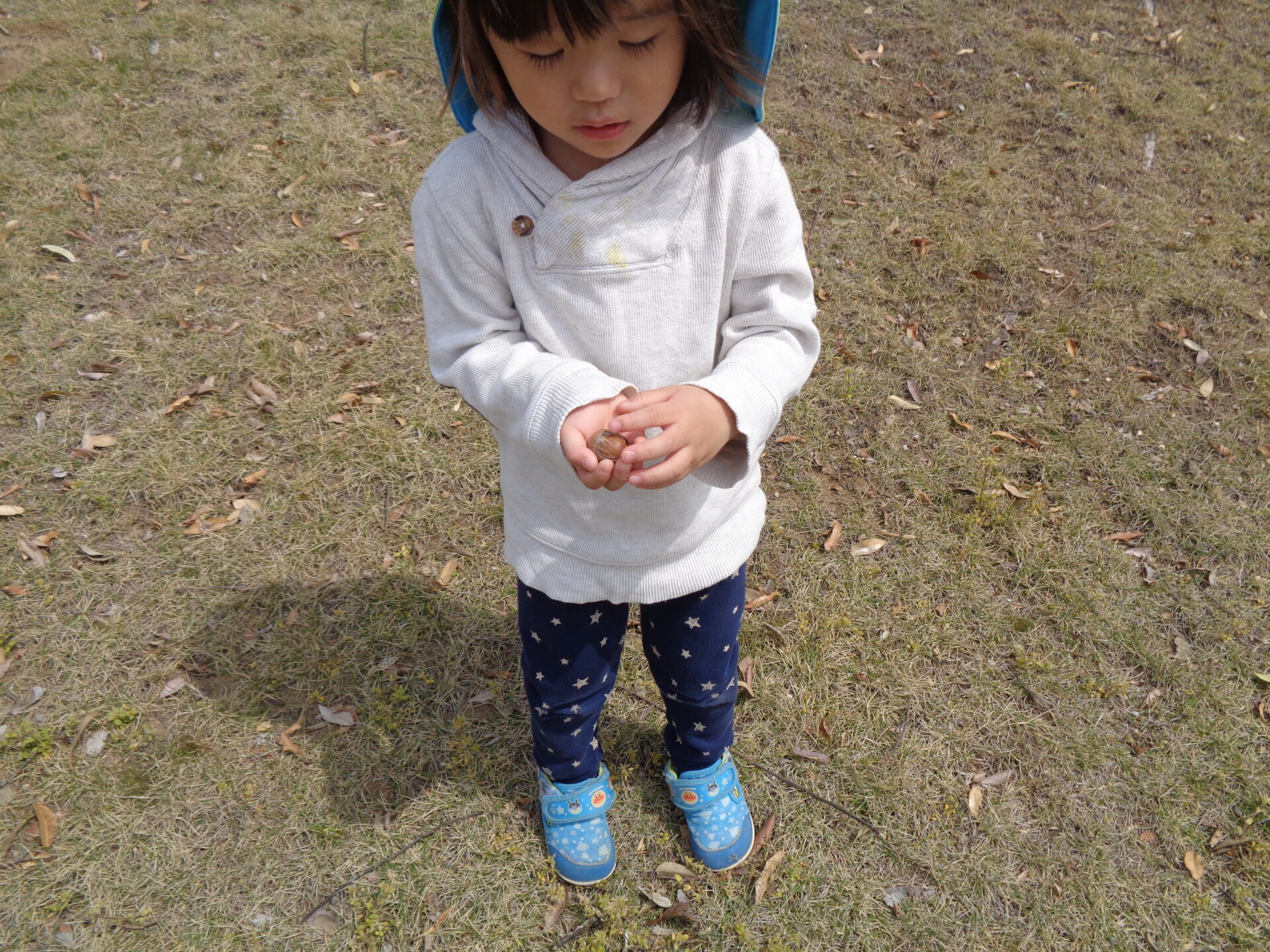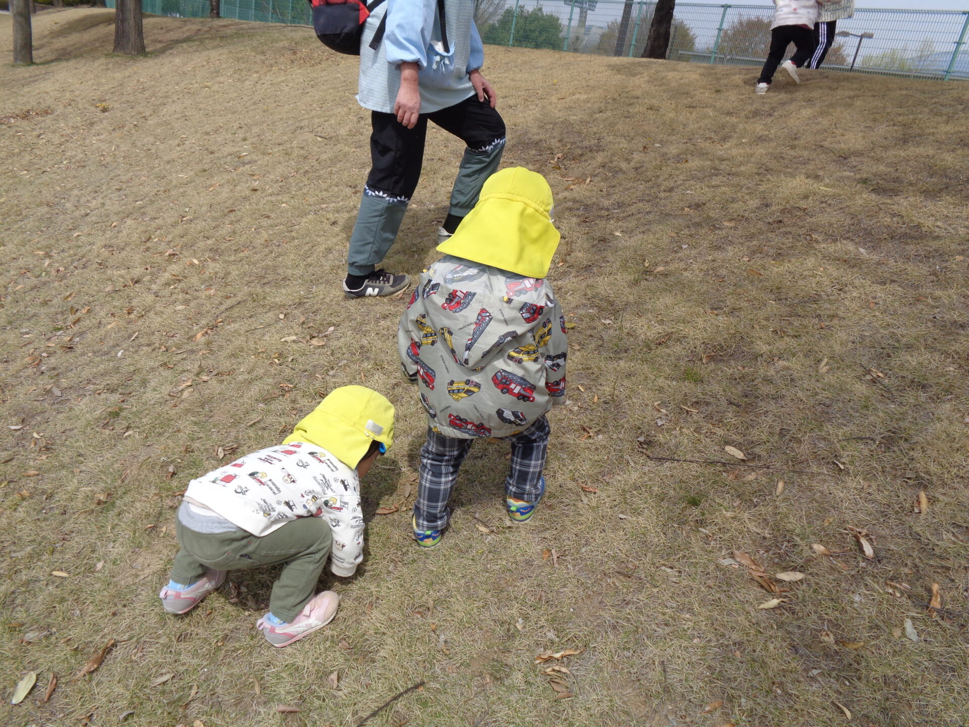 ありを見つけたりどんぐりを拾ったり、いいもの探しにみんな夢中です。