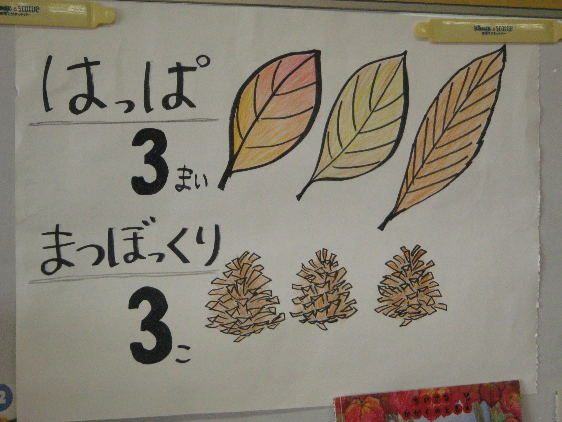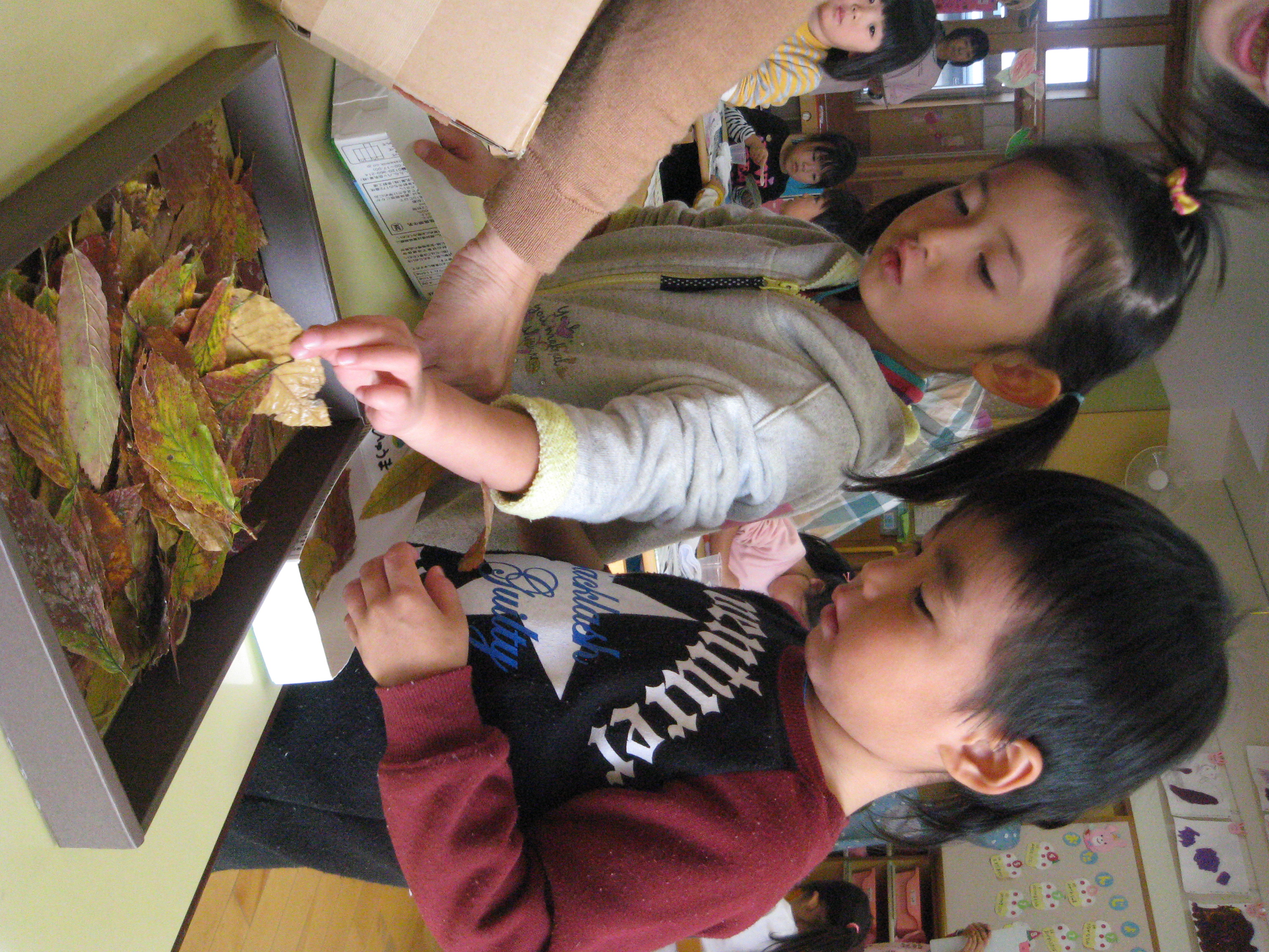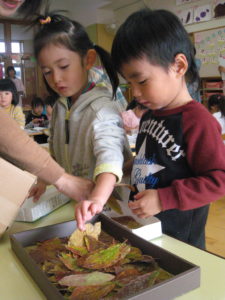 「どれにしょうかな。」「これにしよう。」好きな落ち葉を3枚選びます。