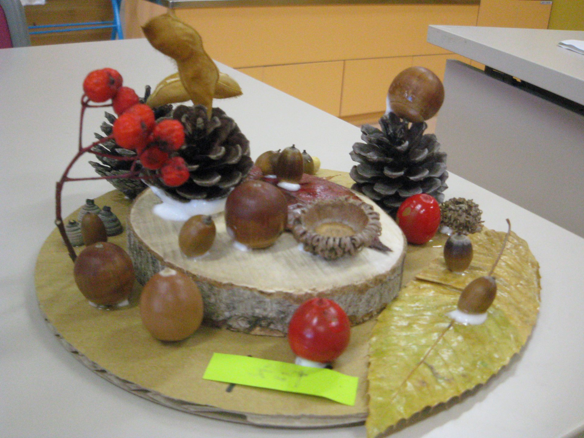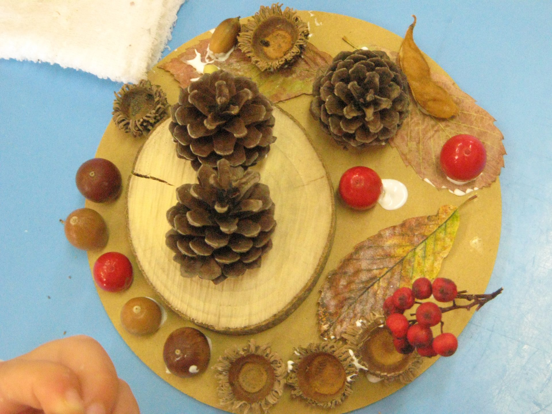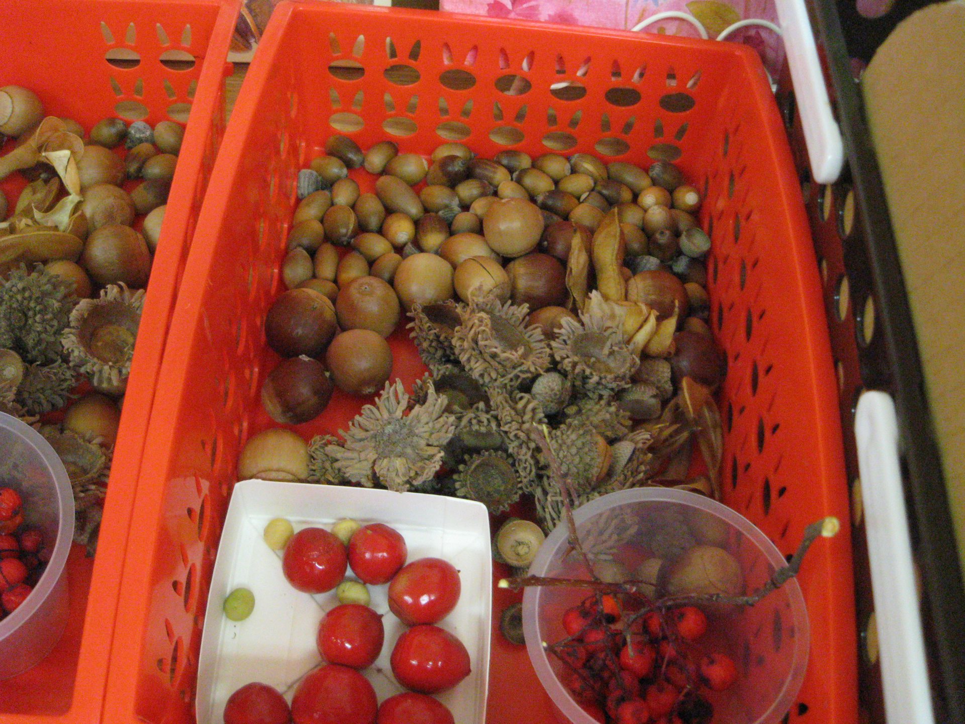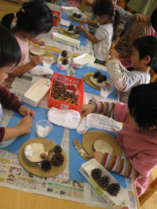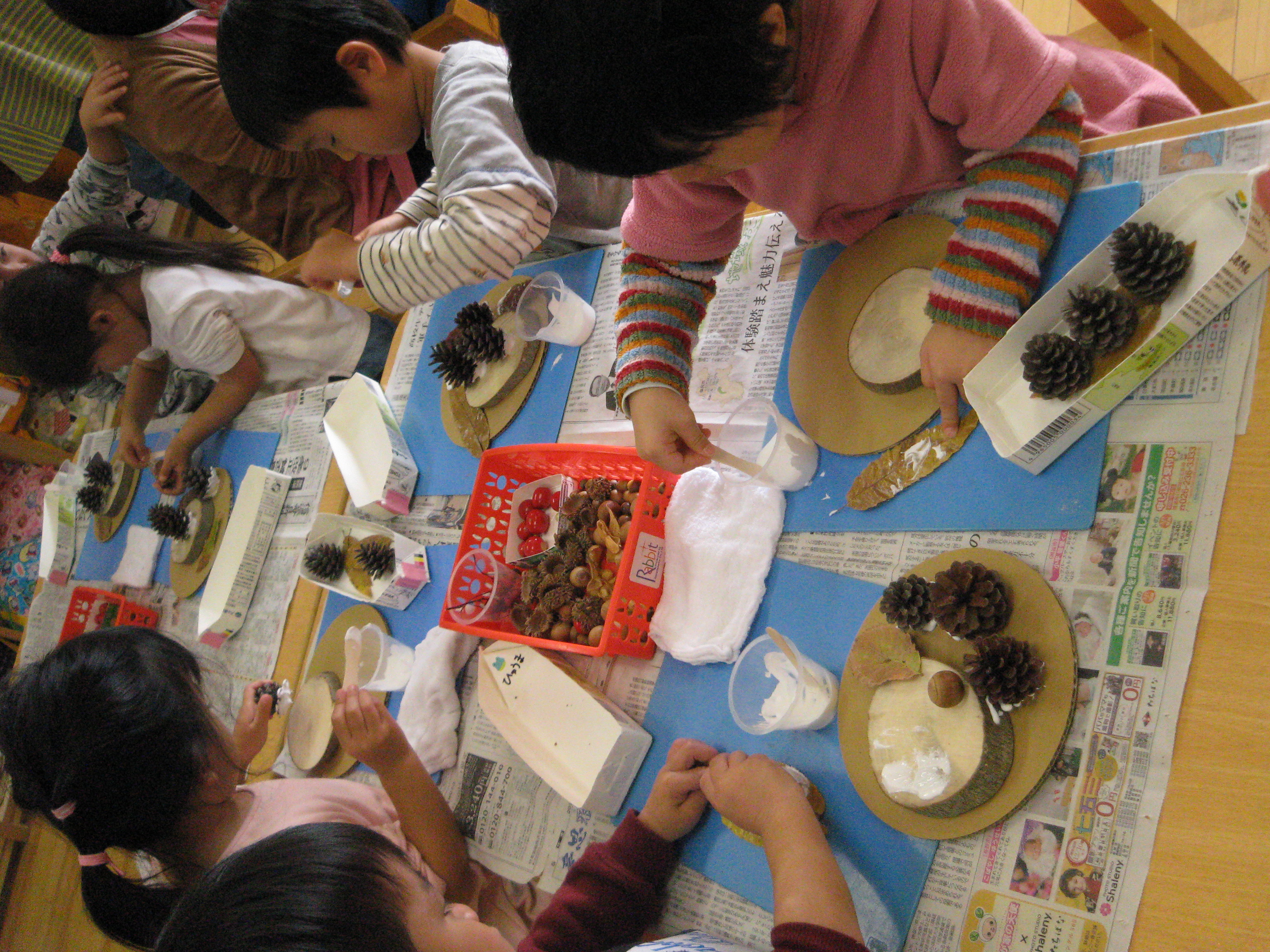 どんぐり、どんぐり帽子、松ぽっくり、ななかまど、枝豆のさや、赤い実は、子どもが「森にはりんごがあるんだよ。」と話した言葉を受け担任が赤く色づけをしたどんぐりです。様々な自然に恵まれた環境です。