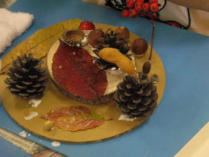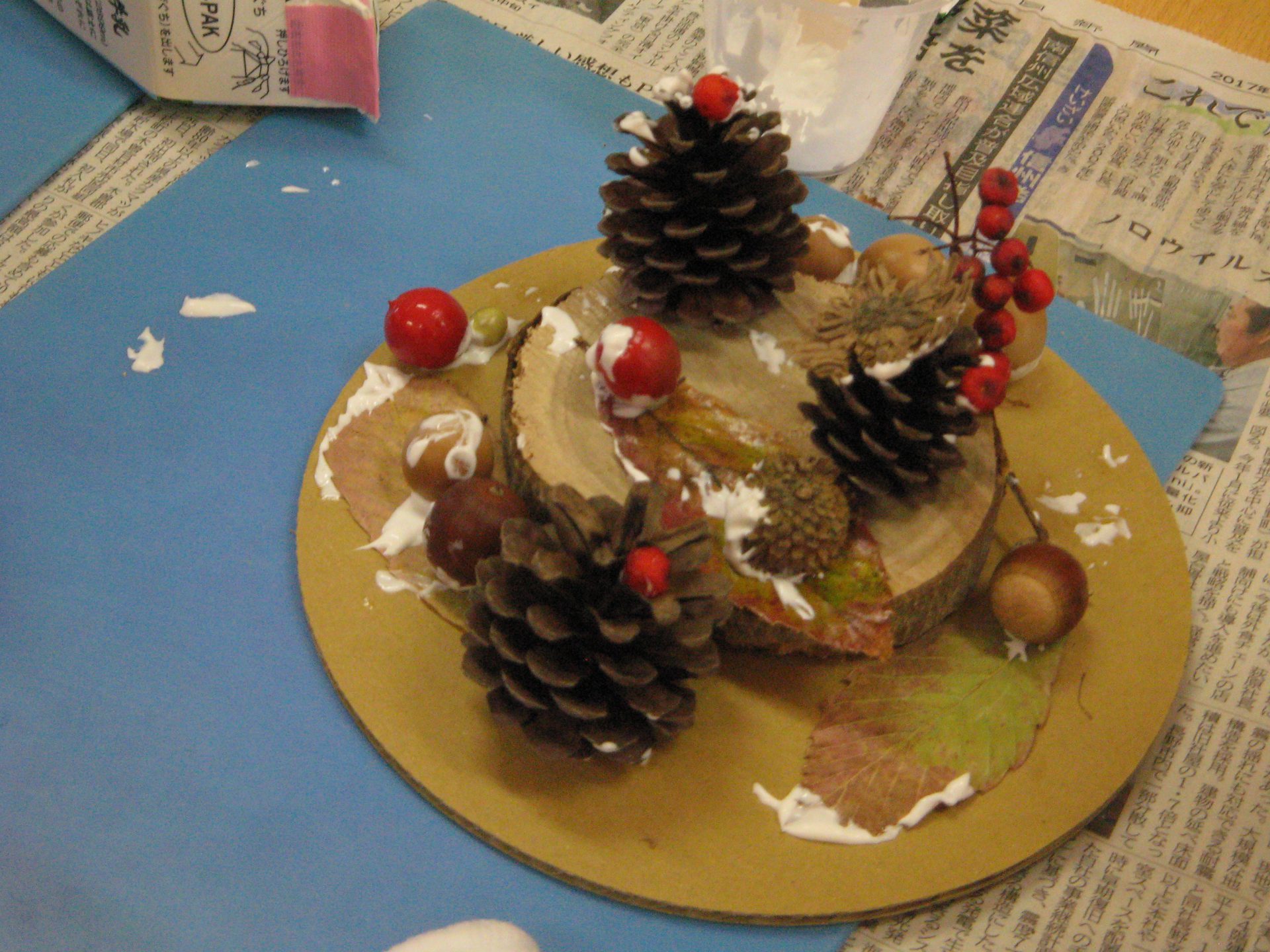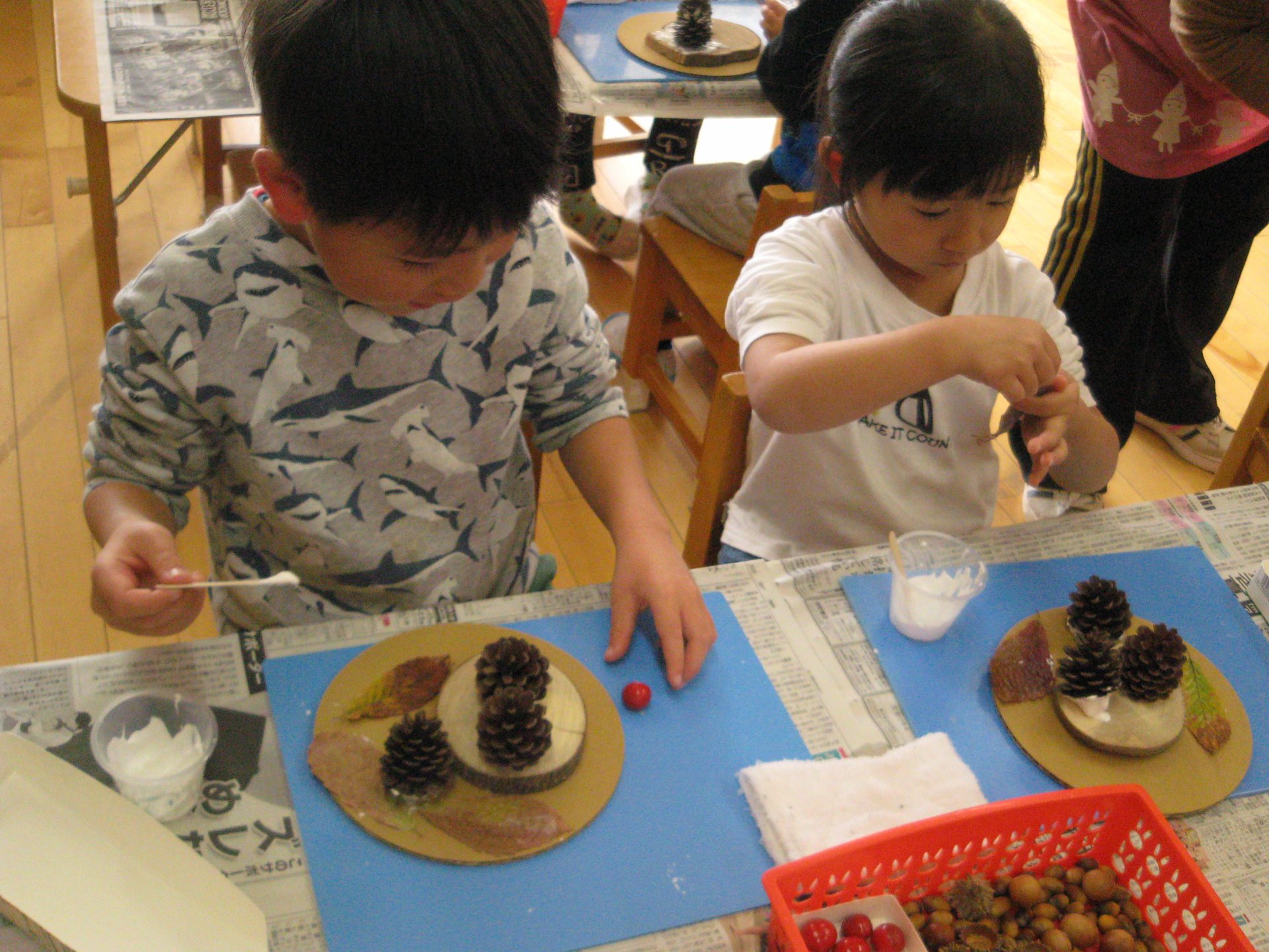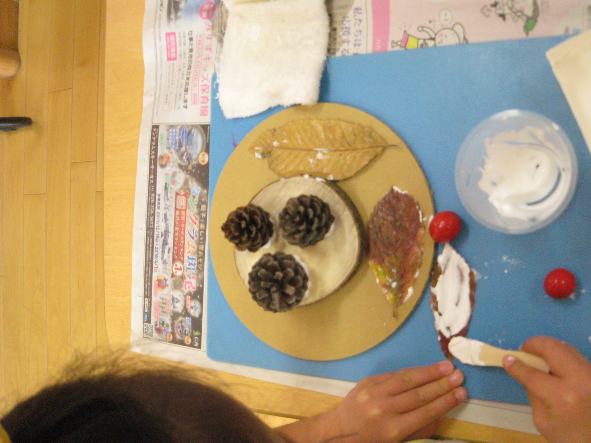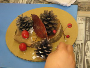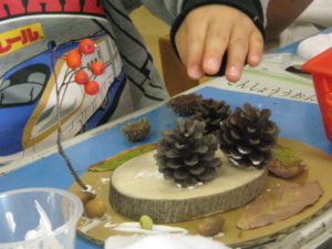 自然豊かな環境で全て穂高荘で拾ってきた物です。落ち葉もボンドでコーティングするとそのままの姿で保存ができ扱いやすくなります。保育士が丁寧に扱い提供することで、子ども達も大切にする意識が芽生えます。一人一人イメージを持ち、自分の森を作ります。