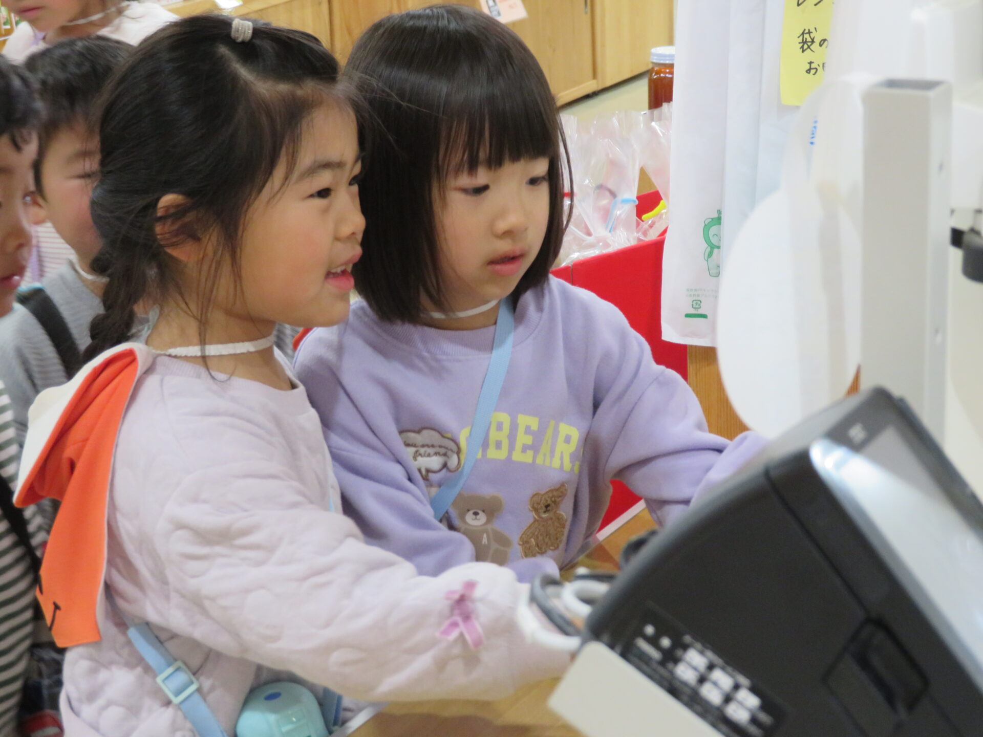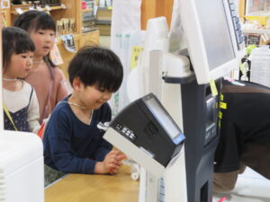 レジの方に「お願いします!」と袋を渡すとレジの方がお買い上げシールを貼ってくださり、お買い物の体験をすることができました。